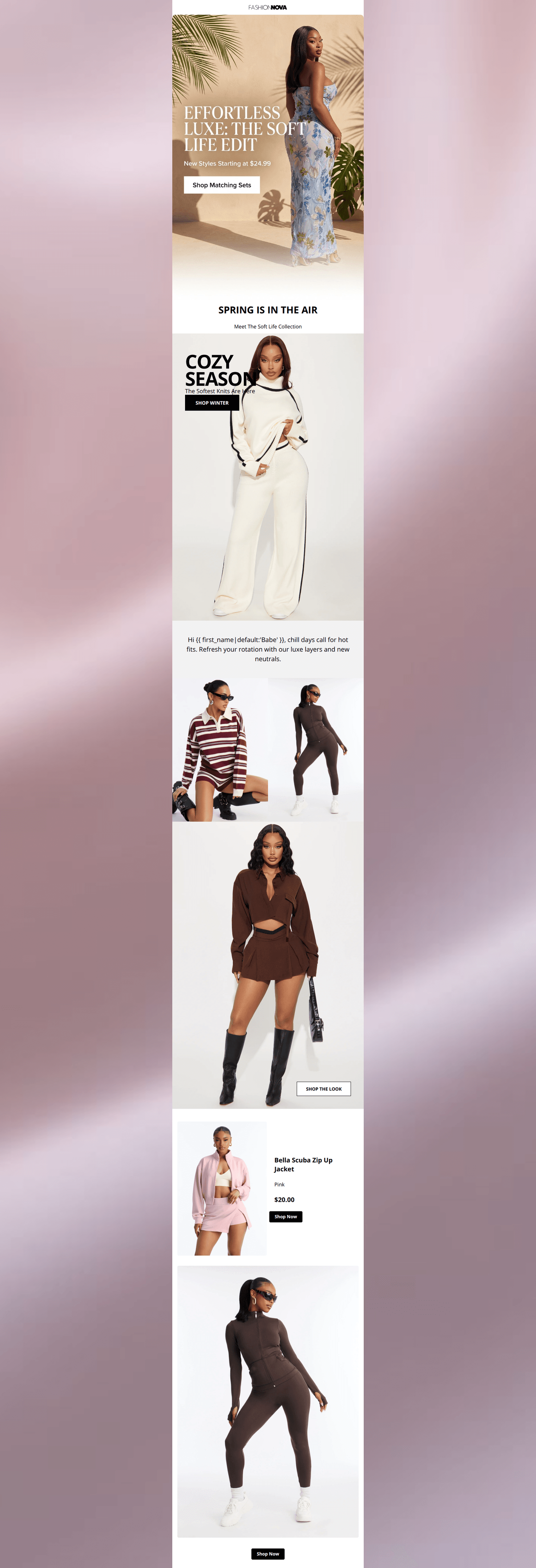 This email leverages Fashion Nova's strong 'Soft Life' aesthetic with high-quality imagery and a culturally relevant hook, which resonates well with the target audience. However, the layout suffers from significant redundancy in the hero section and a product grid that lacks critical commercial information (pricing), creating a disjointed experience that relies too heavily on images alone to drive clicks.