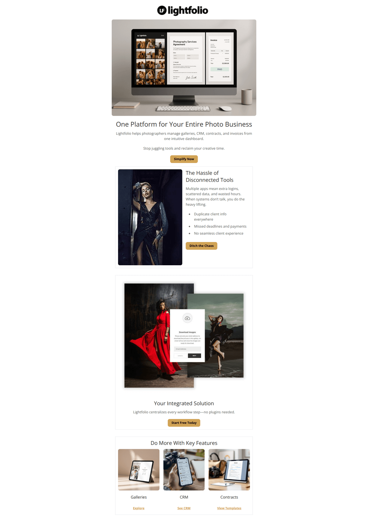Strong, clean email that introduces Lightfolio’s all‑in‑one value with a clear pain → solution flow and attractive visuals. Main conversion friction comes from inconsistent CTAs and a lack of quick trust builders and proof. Tightening CTA language/destinations and adding proof and risk‑reversal copy will lift signups without changing the template.