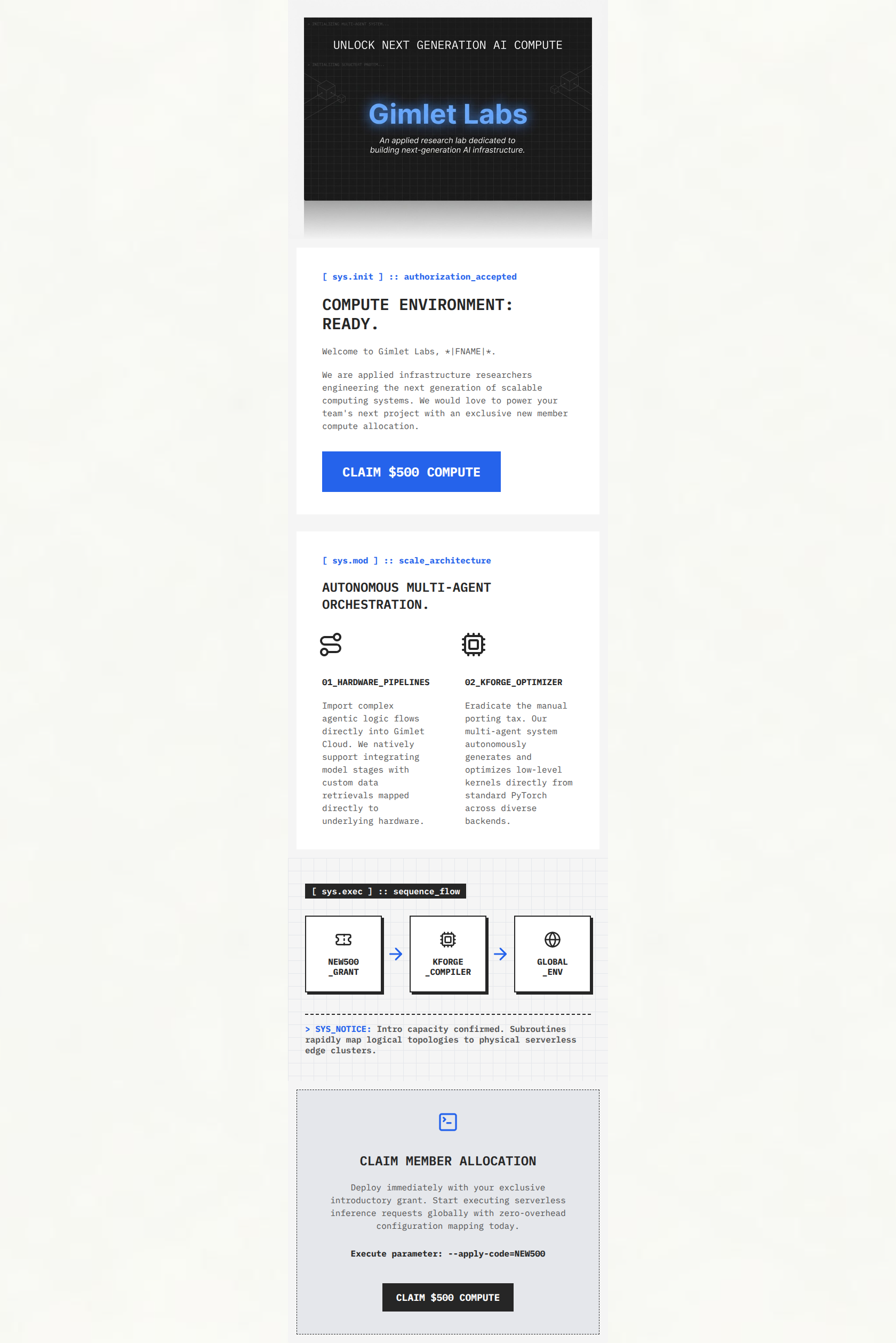 88/100This email is a masterful execution of a highly specific brand voice. By adopting a 'lite brutalist', terminal-inspired aesthetic, Gimlet Labs instantly builds credibility with a deeply technical audience of ML engineers and researchers. The offer ($500 compute) is highly compelling, and presenting the promo code as an 'Execute parameter' is brilliant. However, the rigid adherence to this aesthetic creates minor usability friction: dense text blocks are difficult to skim, and the dark-on-dark CTA at the bottom loses visibility. Minor tweaks to readability and contrast will push this from a great brand piece to an elite conversion engine.