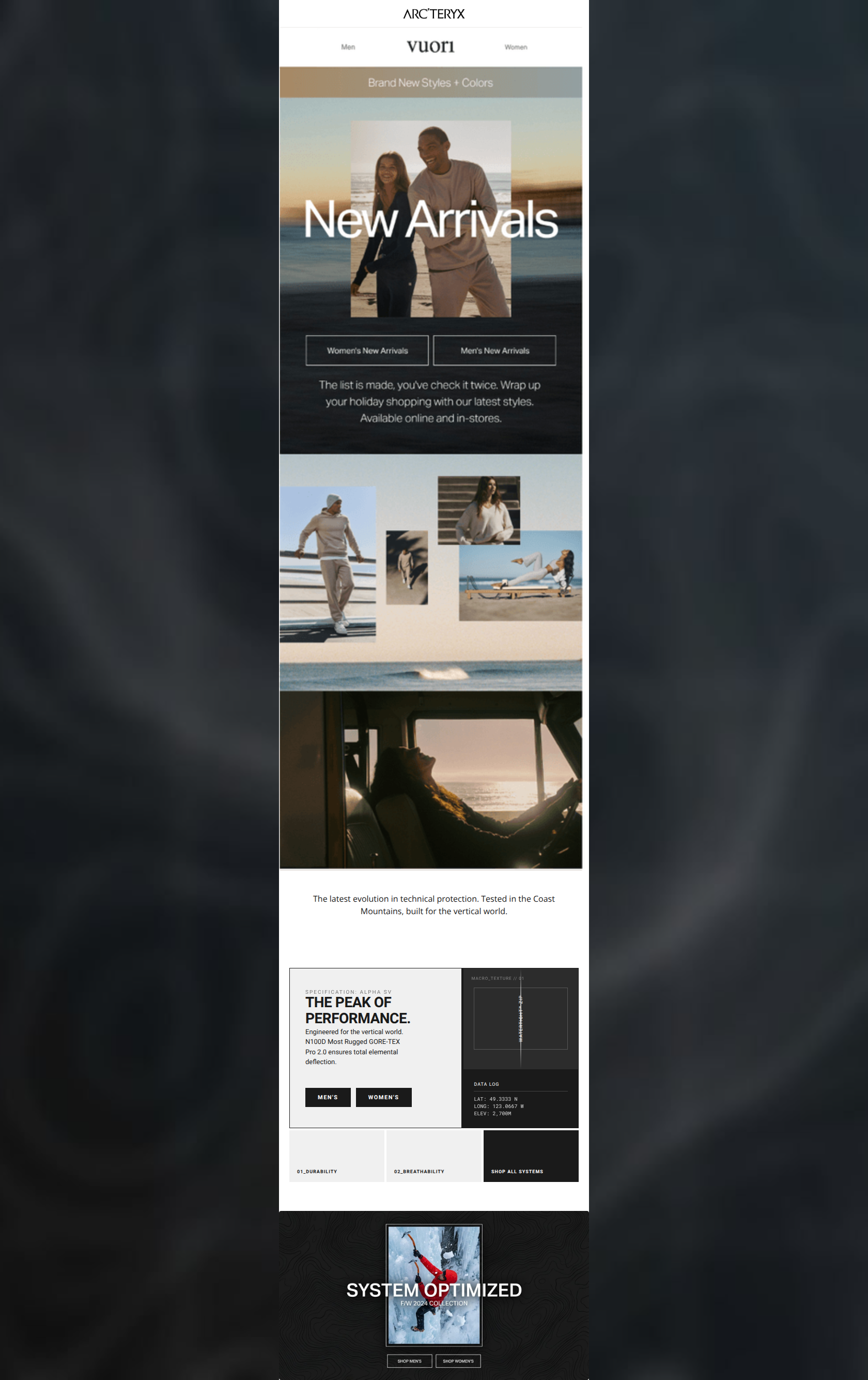 35/100This email represents a critical failure of brand consistency and quality assurance. You have effectively wrapped a creative asset from a competitor (Vuori)—featuring a clashing 'casual beach' aesthetic and explicit logo—inside an Arc'teryx branded shell. While the bottom half of the email correctly utilizes your 'Technical Luxury' design language, the top half destroys all trust and authority immediately upon opening. This creates a confusing, schizophrenic user experience that will likely result in unsubscribes rather than conversions.