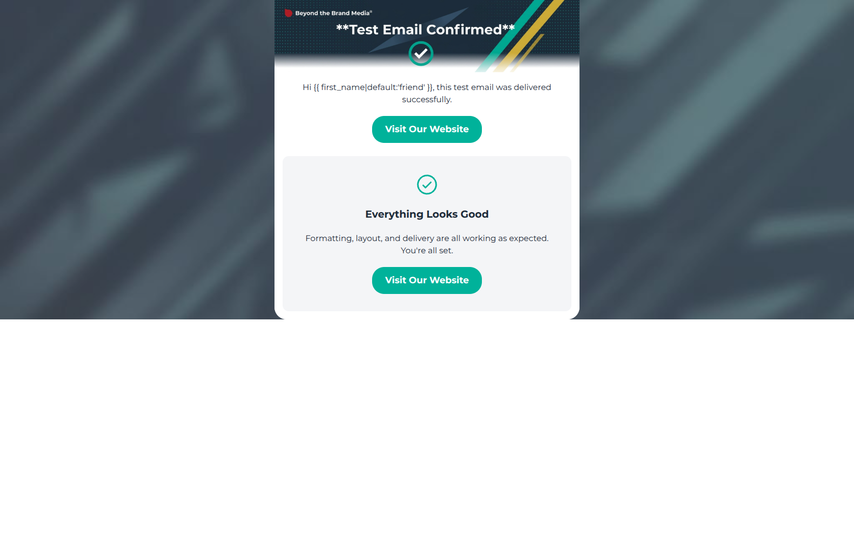 45/100CRITICAL FAILURE: The main body copy is obviously placeholder/system test content ('this test email was delivered successfully') and is completely incoherent for a real customer expecting marketing or business value. Because of this, the overall score is capped at 50. While the email structurally executes the brand's visual identity well—using crisp geometric graphics, the correct color palette, and a consistent, well-repeated CTA—it completely lacks an offer, value proposition, or any messaging tailored to the target audience's pain points. To transform this from a technical test into a conversion asset, it needs a complete content overhaul focused on tangible business outcomes.