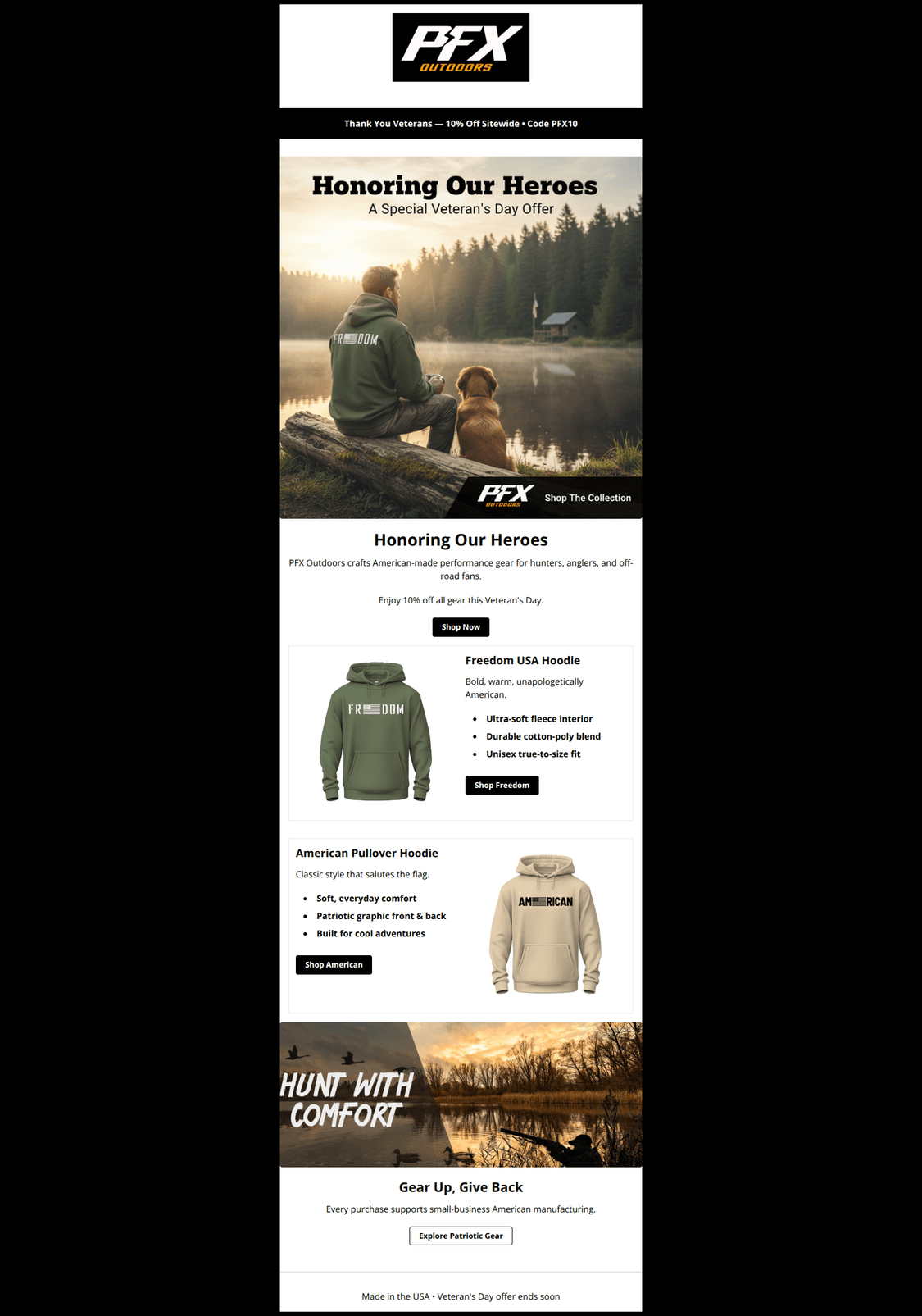 Strong, on-brand patriotic email with clear sections, clean hierarchy, and a straightforward 10% offer. Conversion can improve by tightening offer clarity/urgency, reinforcing the discount near CTAs, fixing a likely link-label mismatch, and adding price/social proof to reduce friction. Consider light personalization by interest (fishing, hunting, off-road) to boost relevance.