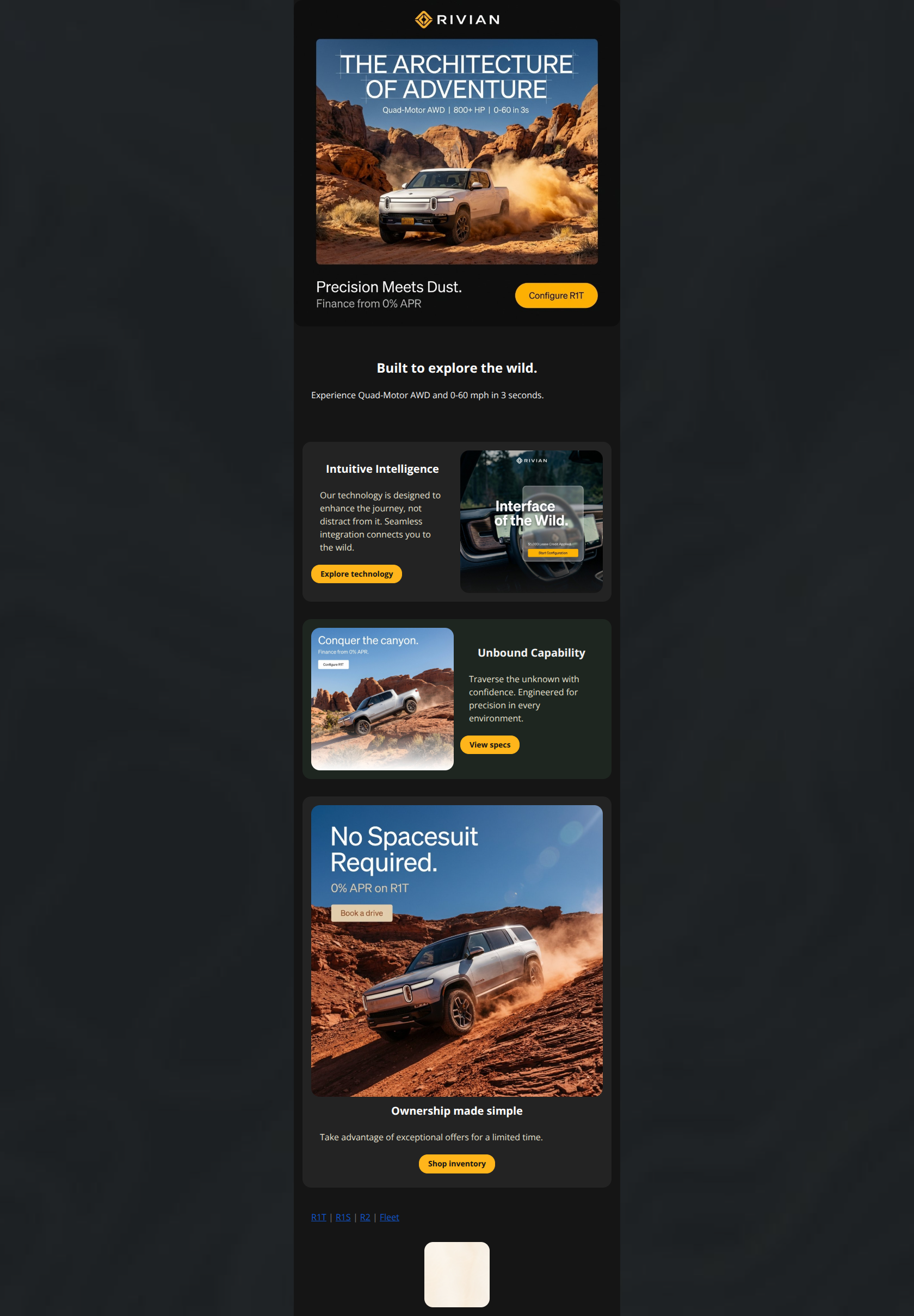 This email is visually stunning and on-brand for a premium automotive player, but it suffers from a significant strategic disconnect between its imagery and its interactive elements. While the offers (0% APR, $5,000 credit) are aggressive and compelling, they are buried inside image files or placed next to low-intent CTAs (like "View specs"), creating a disjointed user journey that confuses education with conversion.