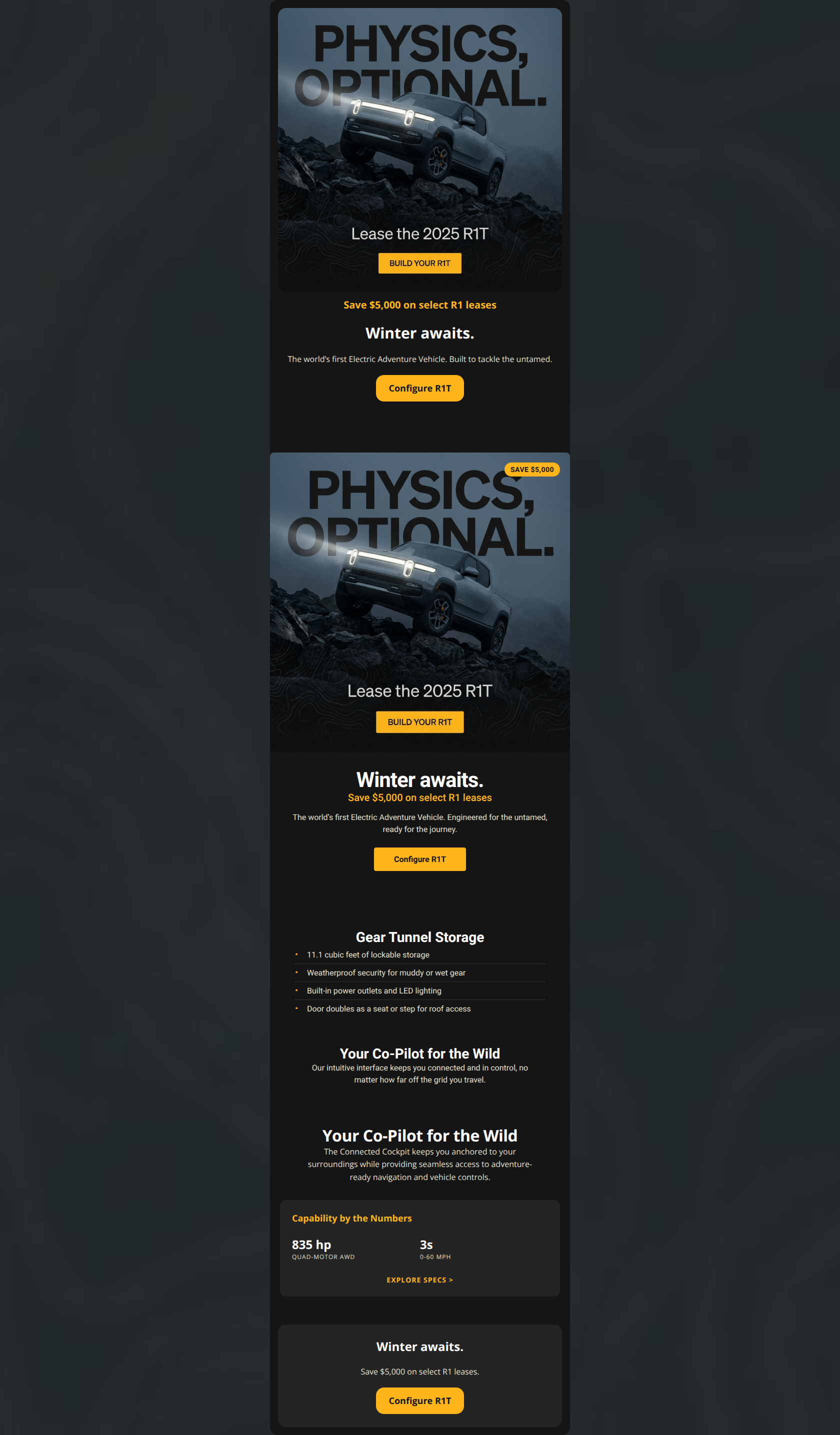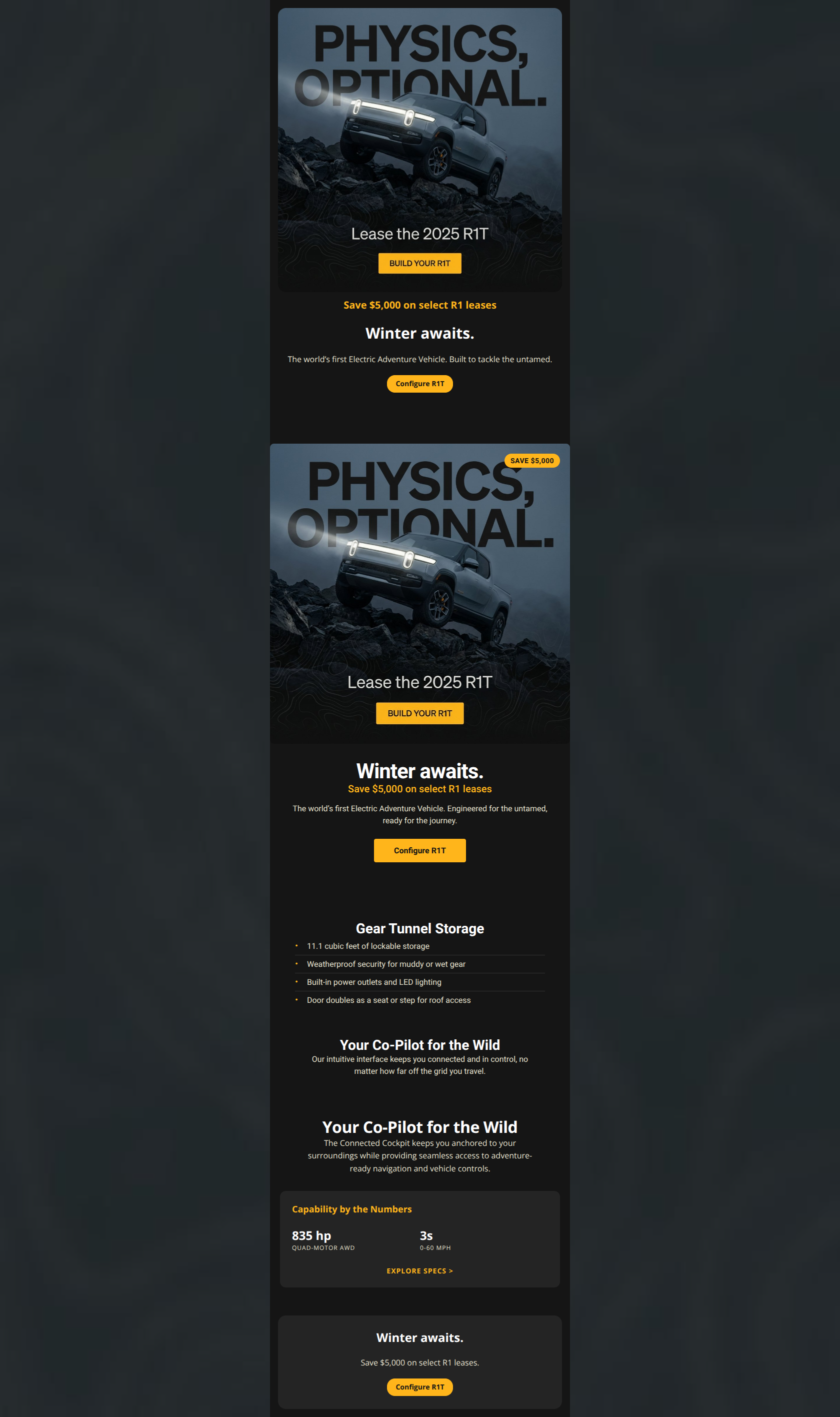 This email visually nails the premium, rugged aesthetic of Rivian but stumbles on conversion mechanics. The biggest strength is the immersive visual storytelling that aligns perfectly with the brand voice, while the biggest weakness is burying the primary financial incentive ($5,000 off) at the very bottom of the email, reducing the urgency to act from the hero section.
