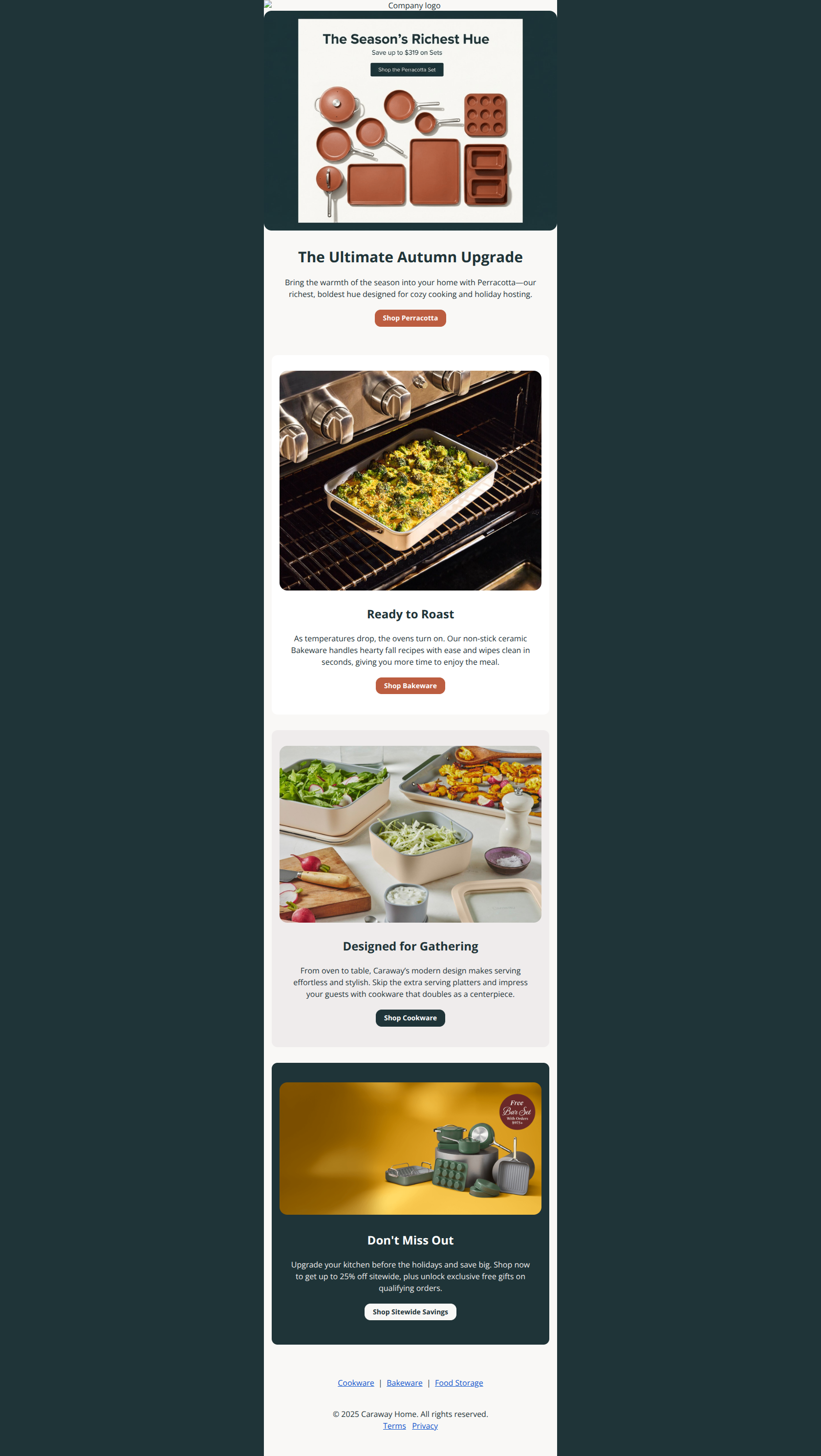 This email features high-quality visuals and a clean, premium aesthetic typical of Caraway, but it buries the lead. The strongest financial incentive (25% off + Free Gift) is hidden at the very bottom, while the hero section suffers from 'visual stutter'βrepeating headlines inside the image and immediately below it in the text. Moving the offer to the top and de-duplicating the hero messaging would significantly improve conversion.