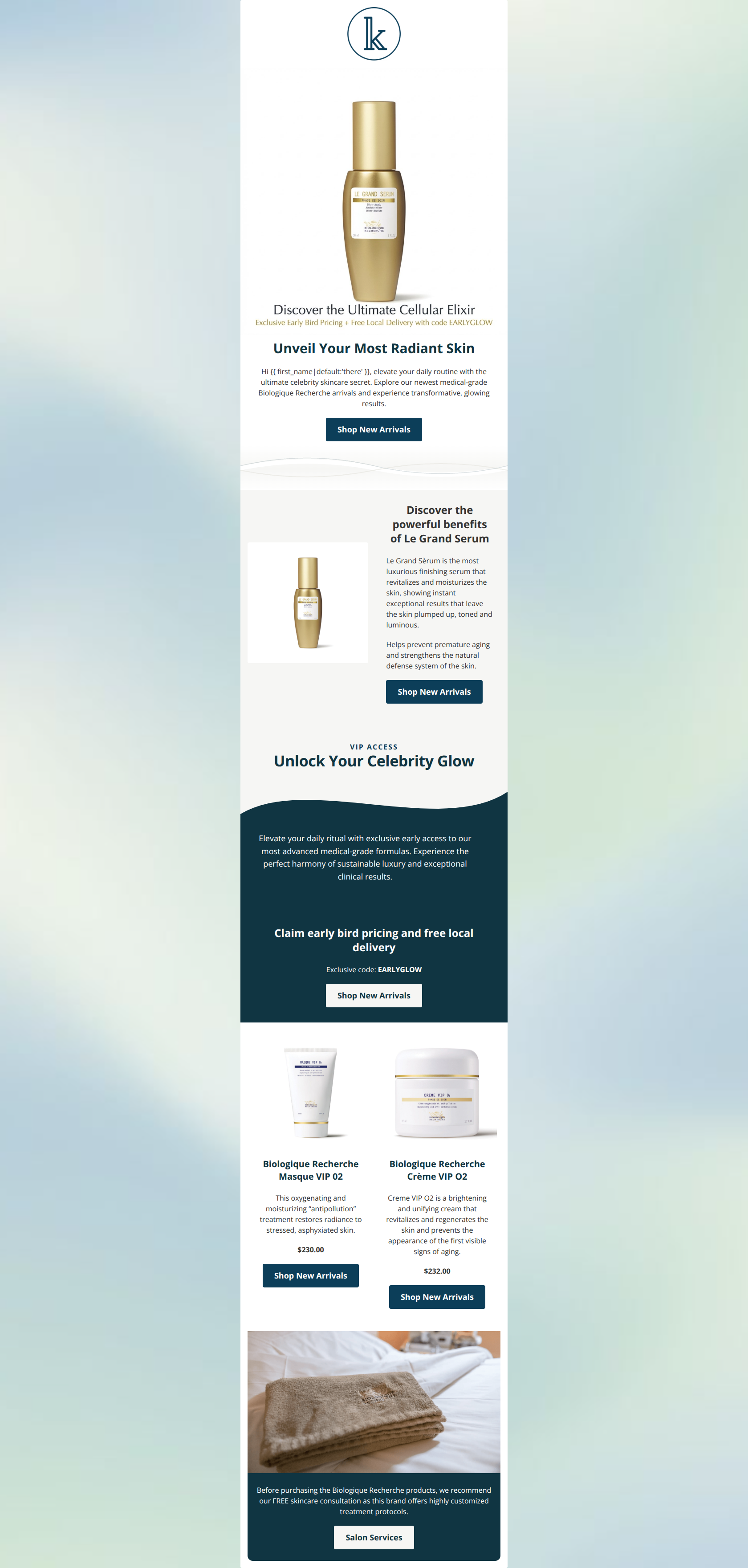 This email successfully establishes a premium, clinical aesthetic that aligns well with the Kolor Twist brand. The progression from hero to product education, promo code, and finally a consultation recommendation is logical and respects the buyer's journey for high-end skincare. However, the execution is hampered by repetitive, generic calls-to-action, important promotional text embedded into a low-contrast image, and sloppy visual alignment in the product grid.