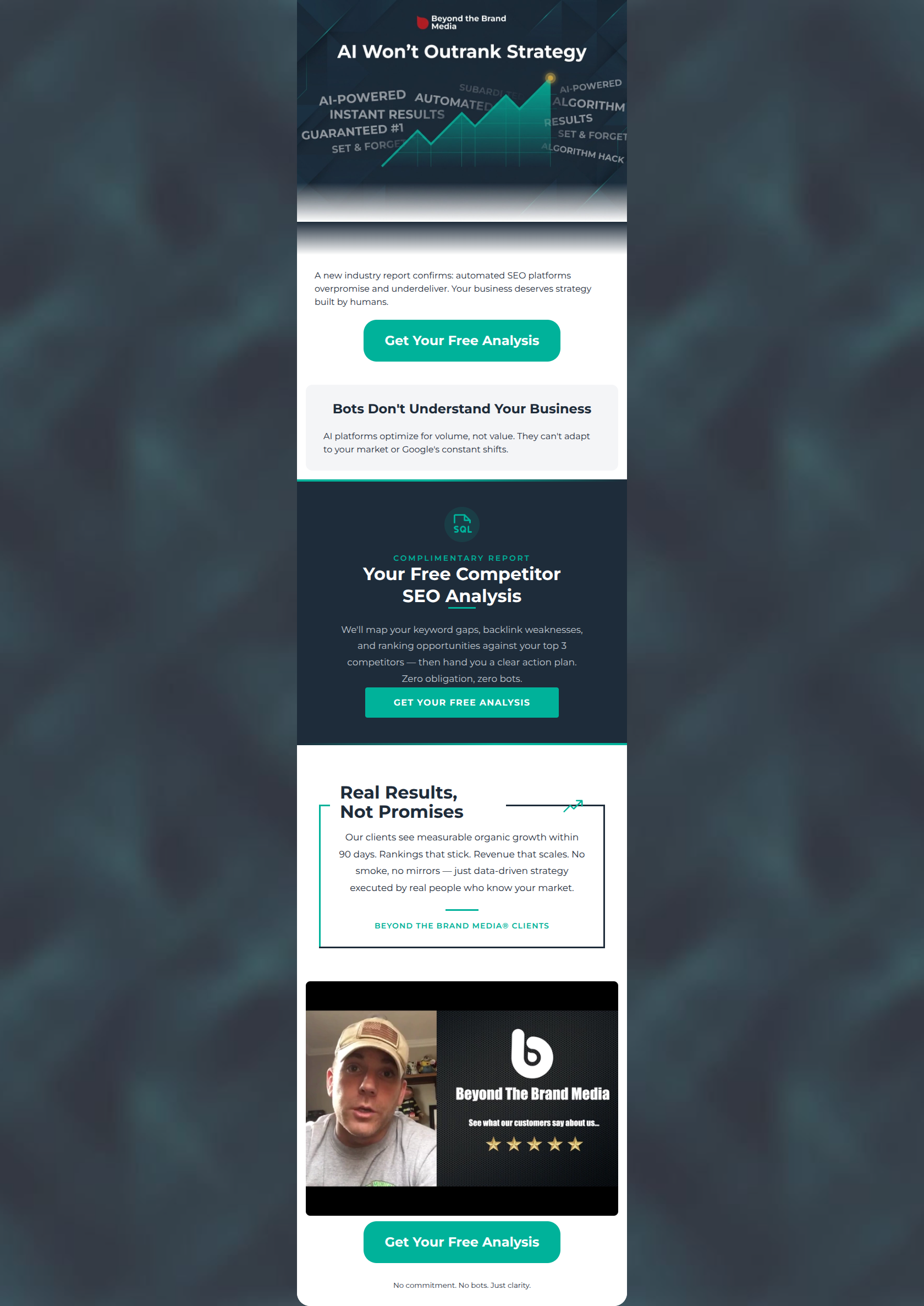 A visually striking email that successfully captures the brand's premium, anti-jargon positioning. The 'human strategy vs. AI bots' narrative is compelling, and the core offer (Free Competitor Analysis) is highly valuable. However, the email buries the actual offer beneath repetitive problem-statement copy and uses some generic elements (vague report claims, unnamed testimonials) that dilute its authority. Tightening the flow and pulling the concrete value proposition higher will significantly improve click-through rates.