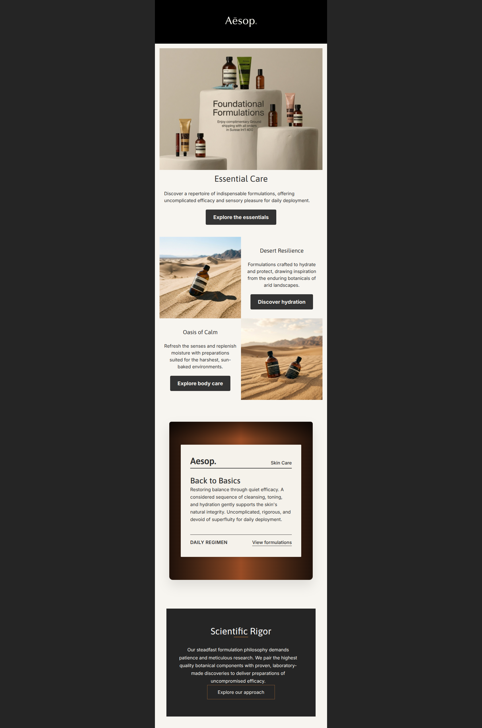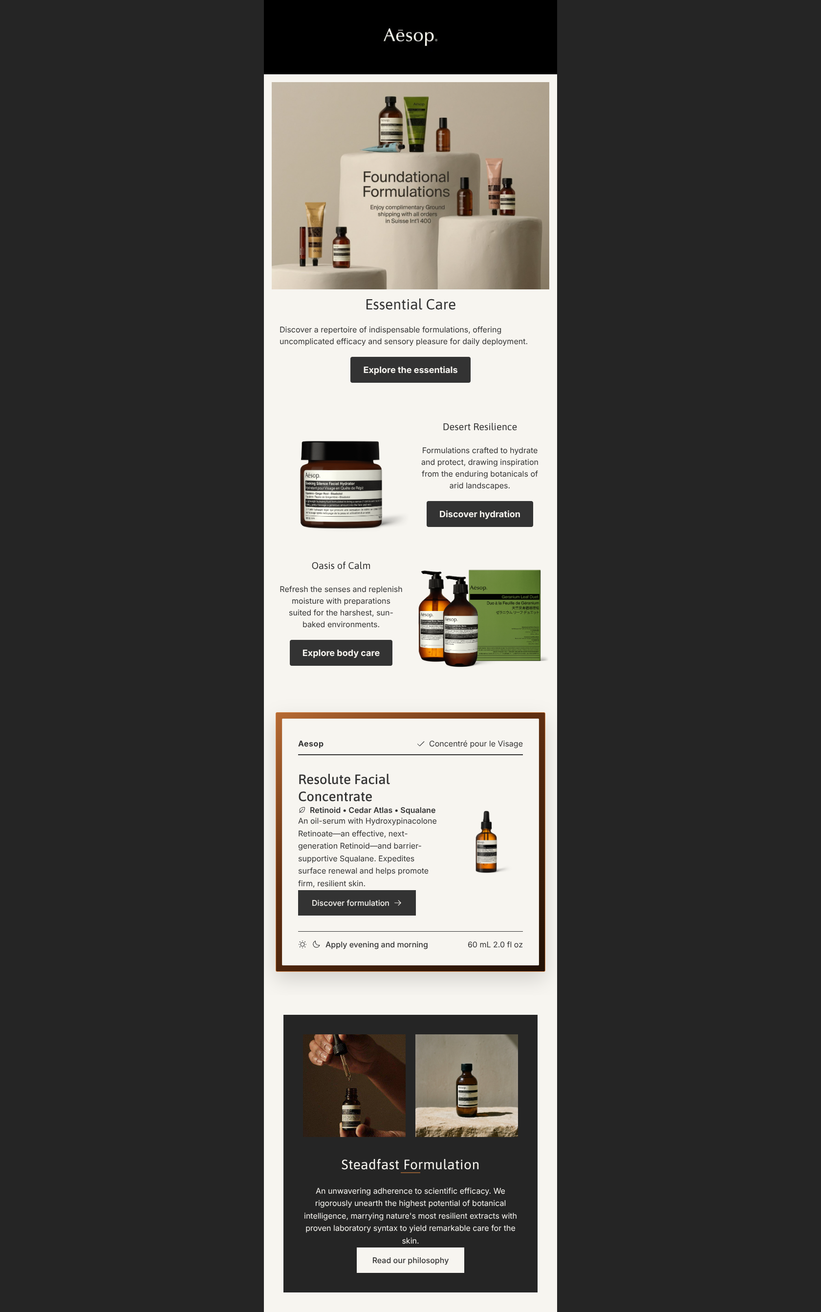 This email fundamentally understands the Aesop brand voice and aesthetic—utilizing stark layouts, literary copy, and distinct color blocking. However, a glaring QA failure in the hero image and disjointed visual assets severely undercut the 'uncompromising quality' the copy boasts about. While the structure is logical, the execution feels unpolished for a luxury brand, leaving money on the table through missed value proposition framing and embedded image text.