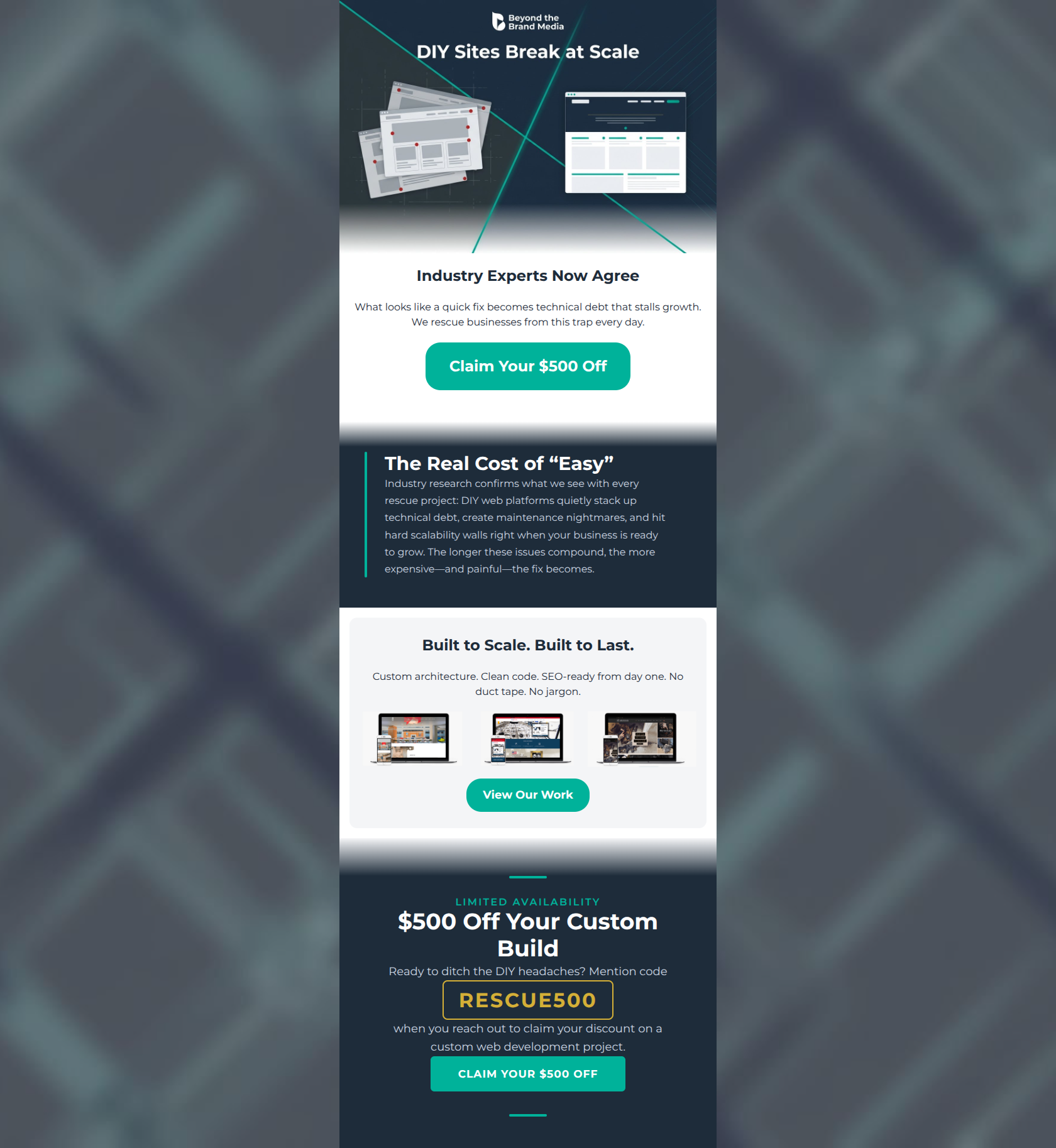 80/100This is a strong, highly targeted email that excels at speaking directly to the target audience's pain points. The brand voice is executed perfectly—authoritative yet jargon-free. The core value proposition of 'escaping the DIY trap' is compelling. However, the email's effectiveness is hampered by a slight mismatch between the premium B2B service being offered and the tactical '$500 off' discount strategy, which feels rushed when introduced immediately in the hero section. Visually, the color blocking is solid, but the muddy gradient transitions detract from the brand's sharp, modern aesthetic.