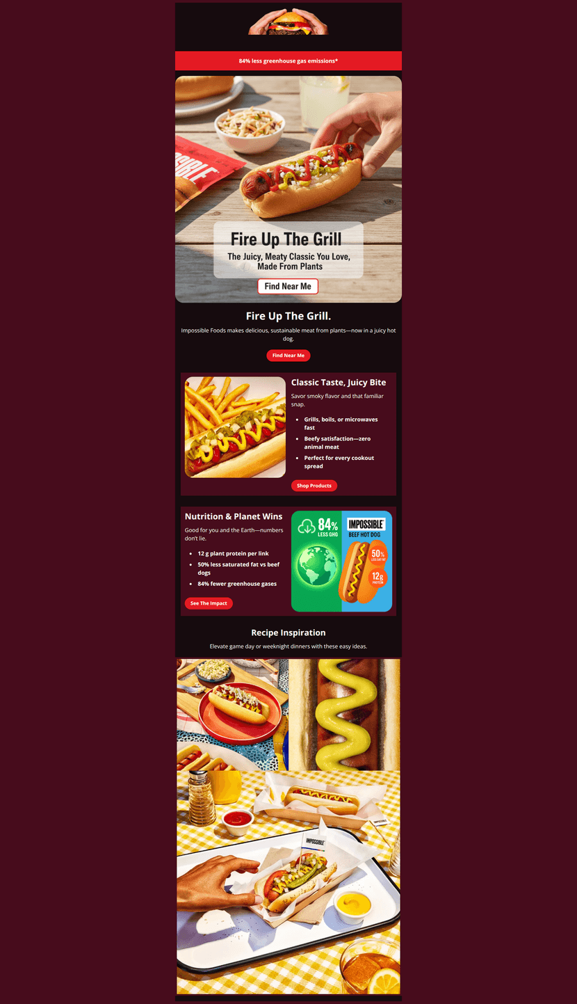 Strong, appetizing creative with clear sustainability and nutrition benefits. Biggest gaps: weak deep-linking and CTA focus, missing claim substantiation footnotes, and no links/CTAs in the recipe section. Tightening offer clarity and aligning every section to a single primary action (βFind Near Meβ or product PDP) will lift click-through and store locator conversions.