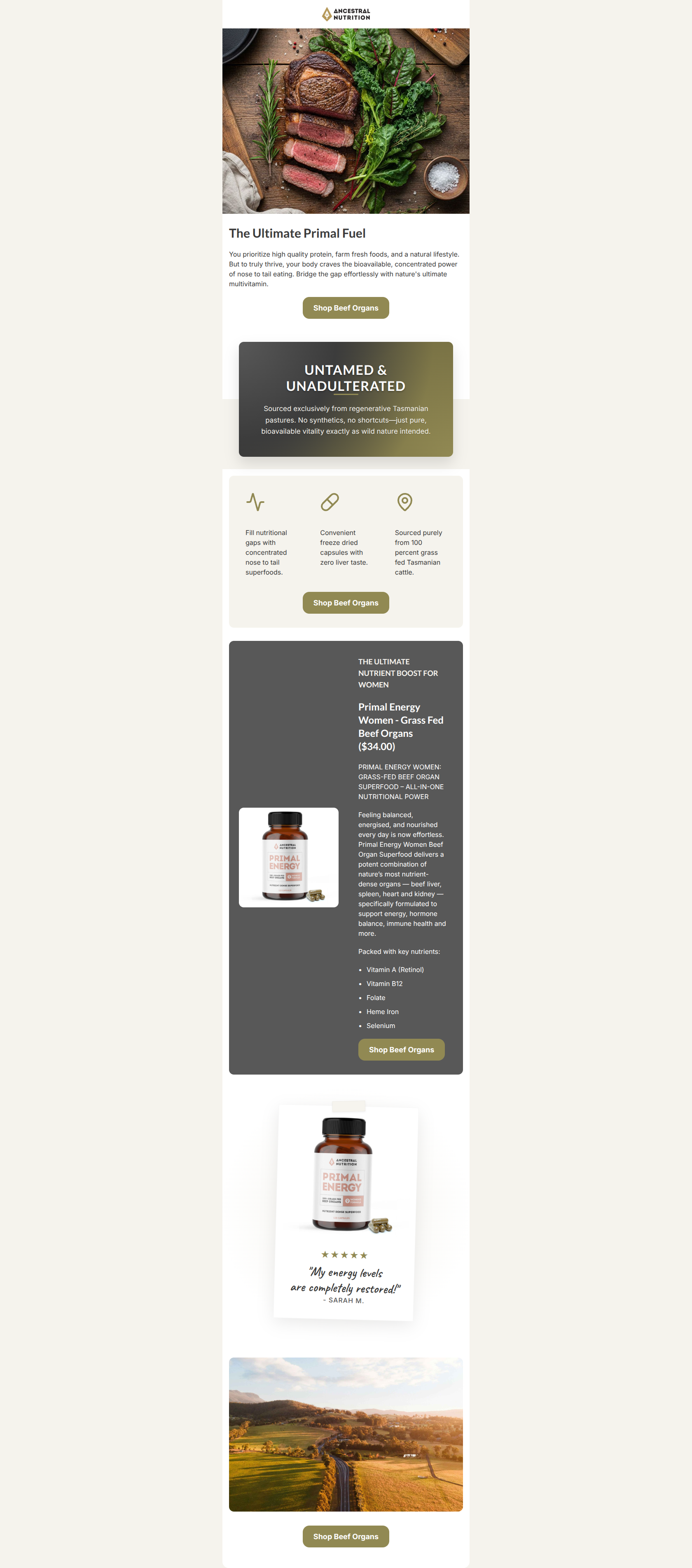 74/100This email successfully captures the rugged, premium aesthetic of the Ancestral Nutrition brand and speaks fluently to the ancestral/carnivore demographic's desires. However, it suffers from a slight visual disconnect in the hero section (showing only meat instead of the supplement) and relies on dense, unpolished copy in the primary product feature block. By refining the CTA hierarchy, tightening the copy, and clarifying the product-to-lifestyle connection earlier, this email can significantly reduce friction and drive higher click-through rates.