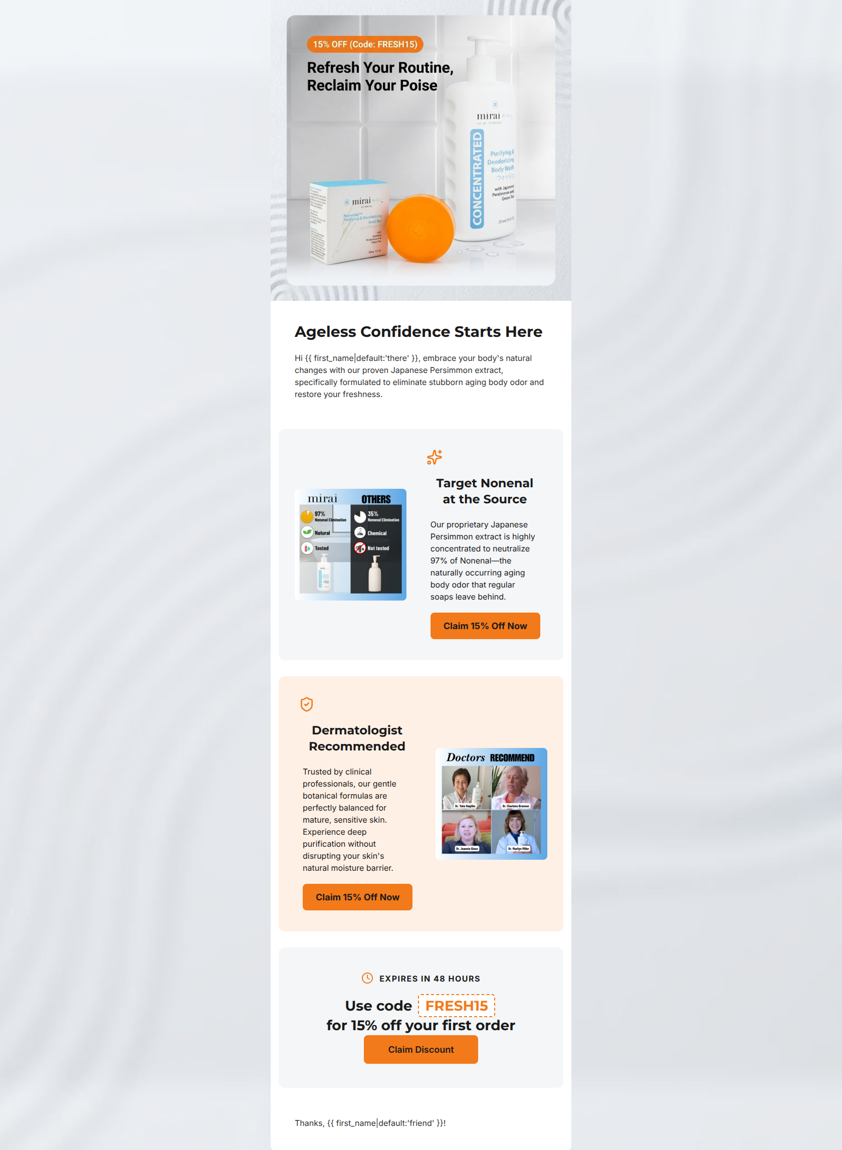 74/100This email features strong, empathetic copywriting that aligns perfectly with the brand's 'trusted confidante' persona and mature demographic. The core value proposition—eliminating Nonenal—is communicated clearly and backed by scientific and authoritative framing. However, the email suffers from a significant conversion flaw: the complete absence of a Call-to-Action (CTA) button in the top/hero section. The reader is forced to scroll past an image, a headline, and a paragraph of text before encountering the first clickable button. Additionally, repetitive CTA copy and a poorly scaled comparison graphic hinder an otherwise competent layout.