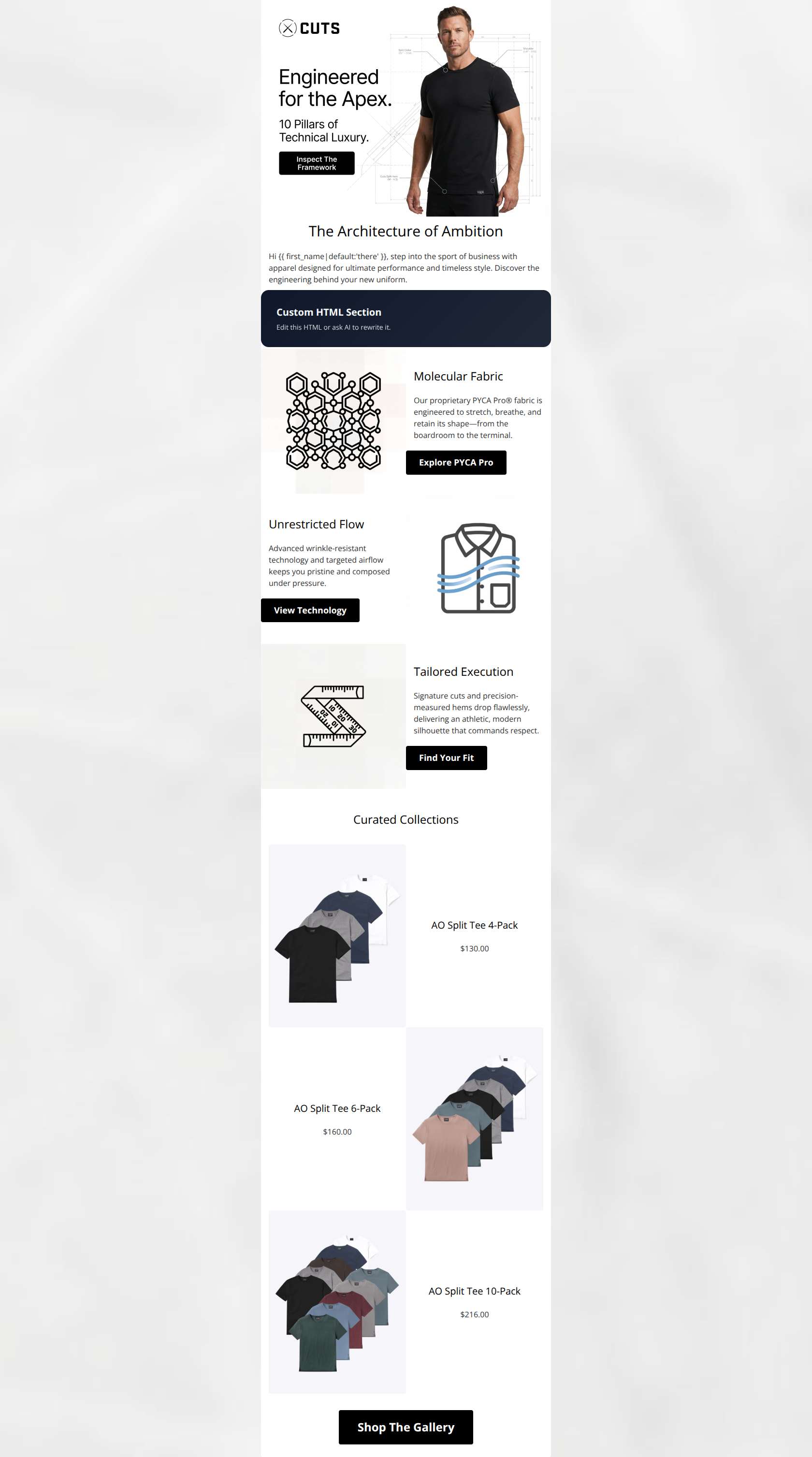 This email features a strong, aspirational brand voice and high-quality hero imagery that effectively targets the 'Sport of Business' demographic. However, the conversion path is undermined by disjointed product offerings at the bottom and 'false scent' CTAs that promise specific information but all link to a generic best-sellers page.