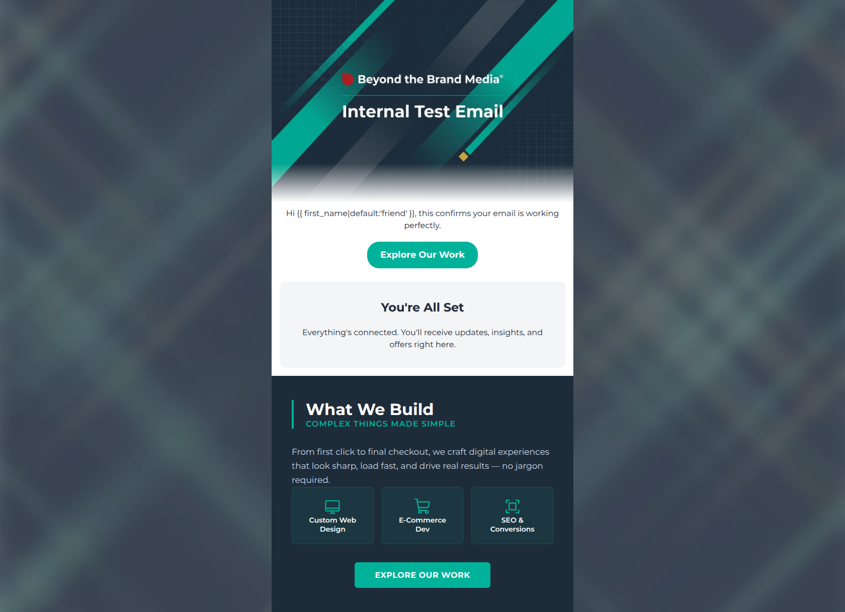 50/100CRITICAL FAILURE: The hero section explicitly states 'Internal Test Email' and the intro copy confirms 'your email is working perfectly.' If this was accidentally sent to a live list, it provides zero value proposition or reason for a prospect to engage. Because the most valuable real estate in the email is dedicated to internal testing copy rather than customer benefits, the overall score is capped at 50. Visually, the email is strong and aligns well with the brand's modern, technical aesthetic, but the messaging needs a complete rewrite to function as a conversion vehicle.