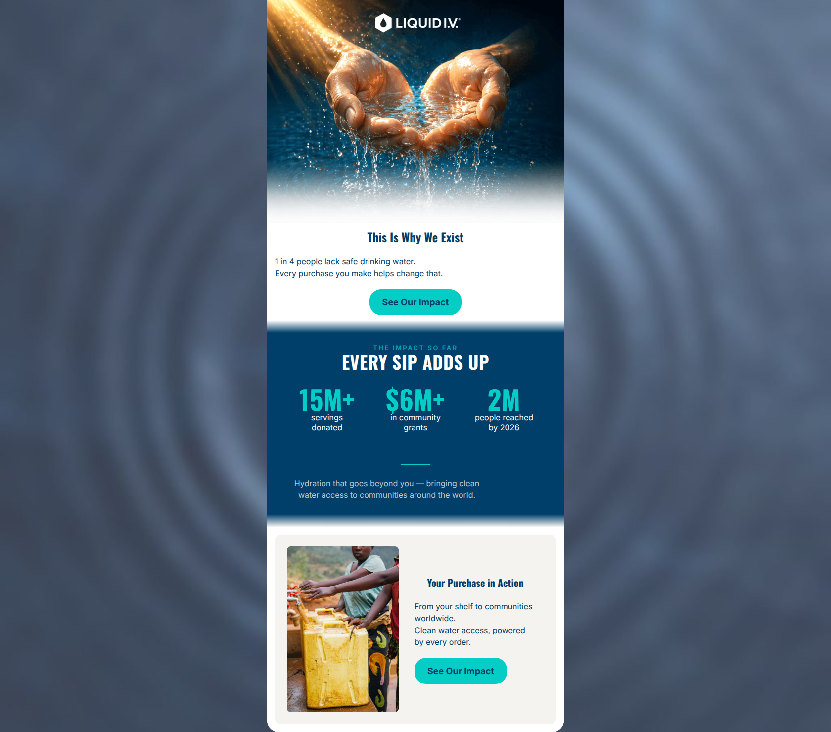 83/100Liquid I.V. delivers a visually striking and emotionally resonant impact email that perfectly aligns with its purpose-driven brand voice. The email excels in visual hierarchy, utilizing a high-contrast palette and a highly scannable layout to guide the reader effortlessly toward a repeated, unambiguous call-to-action. By framing the customer as the catalyst for change ('Your Purchase in Action'), the copy successfully taps into the target audience's desire for ethical consumption. However, while the email is beautiful and conceptually sound, it lacks a compelling 'why now' factor. The narrative becomes slightly repetitive in the final section, and the absence of any tangible connection to a specific product or a timely milestone raises the barrier to actually clicking through. It is a very strong brand-building piece that could be optimized for higher click-through rates by introducing urgency and tighter narrative progression.
