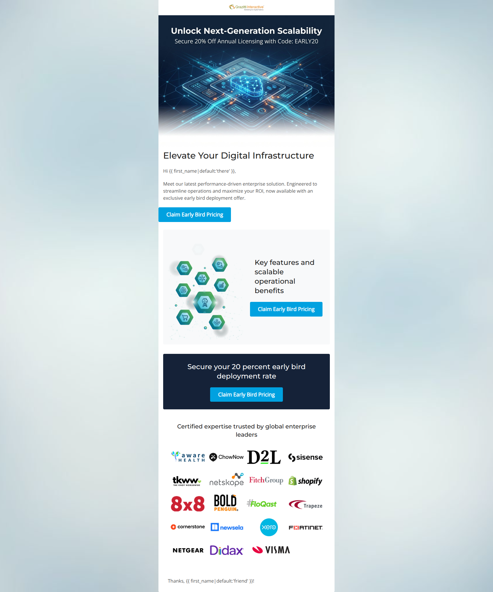 55/100While visually clean and technically well-structured with excellent color contrast, this email suffers from a near-critical failure in message clarity by completely omitting the name and specific function of the product being launched. It relies heavily on generic enterprise buzzwords, asking users to commit to pricing before explaining the value proposition. The biggest strength is the clear visual hierarchy and strong CTA contrast; the biggest weakness is the 'mystery box' copywriting that fails to identify the product.
