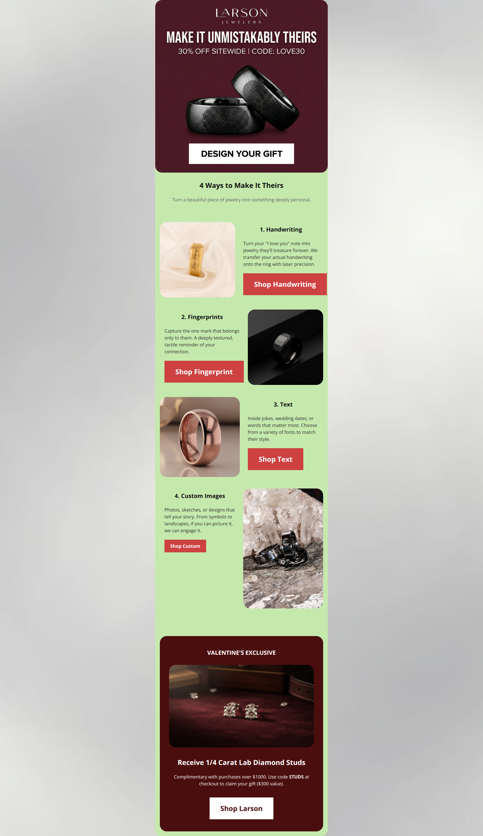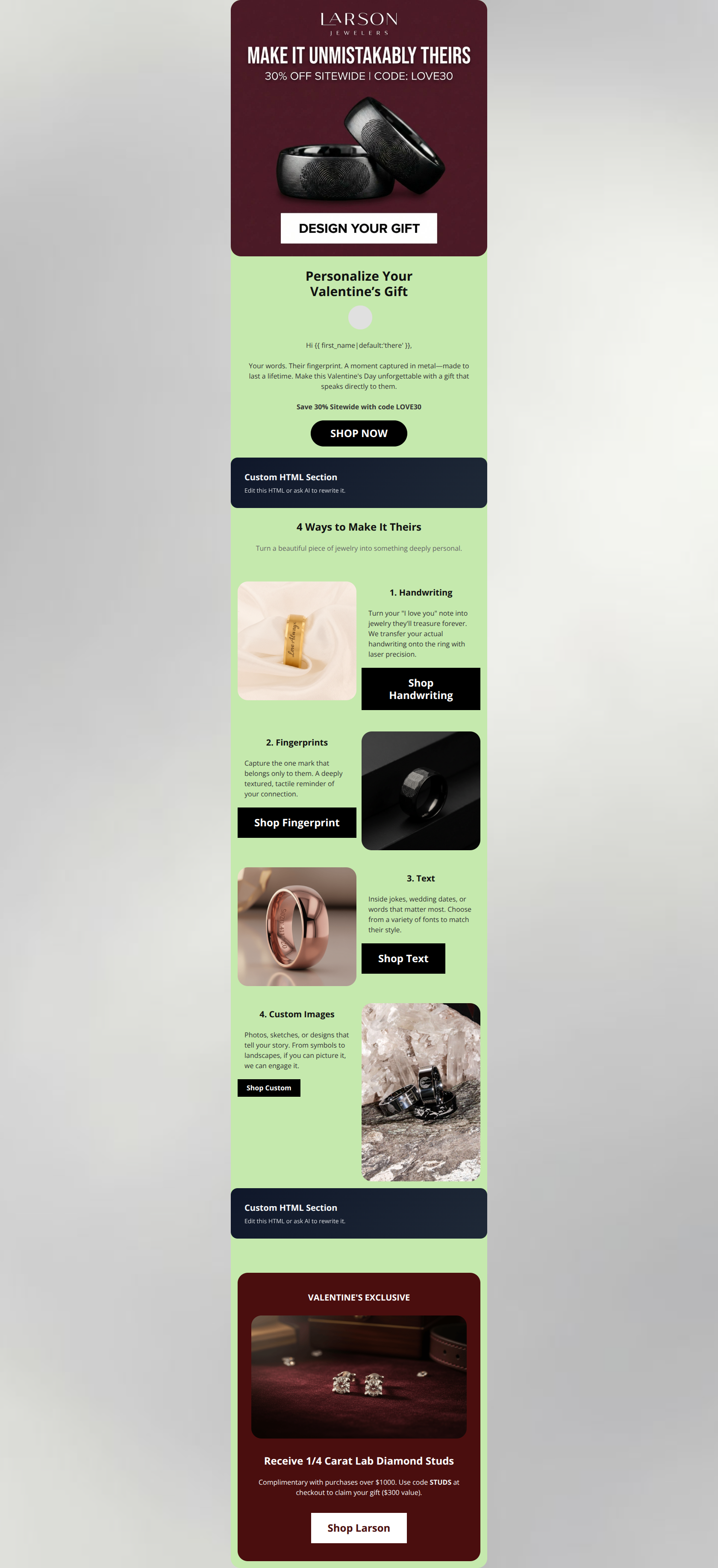 This email effectively leans into the brand's "Masculine Luxury" identity with a strong visual narrative around personalization. The "4 Ways to Make It Theirs" section is a standout example of product education driving desire. However, the email suffers from "promo conflict" by introducing two competing discount codes (LOVE30 and STUDS) without clarifying if they stack, which creates high cognitive load and hesitation at the decisive moment.