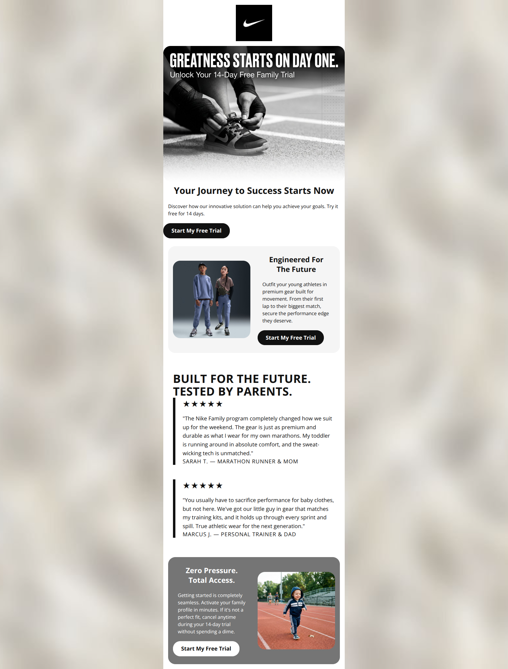 This email suffers from a critical failure: despite strong visual branding and a clear target audience, it completely fails to explain what the "14-Day Free Family Trial" actually is. The hero copy reads like generic placeholder text, creating a massive clarity gap that will severely limit conversion.