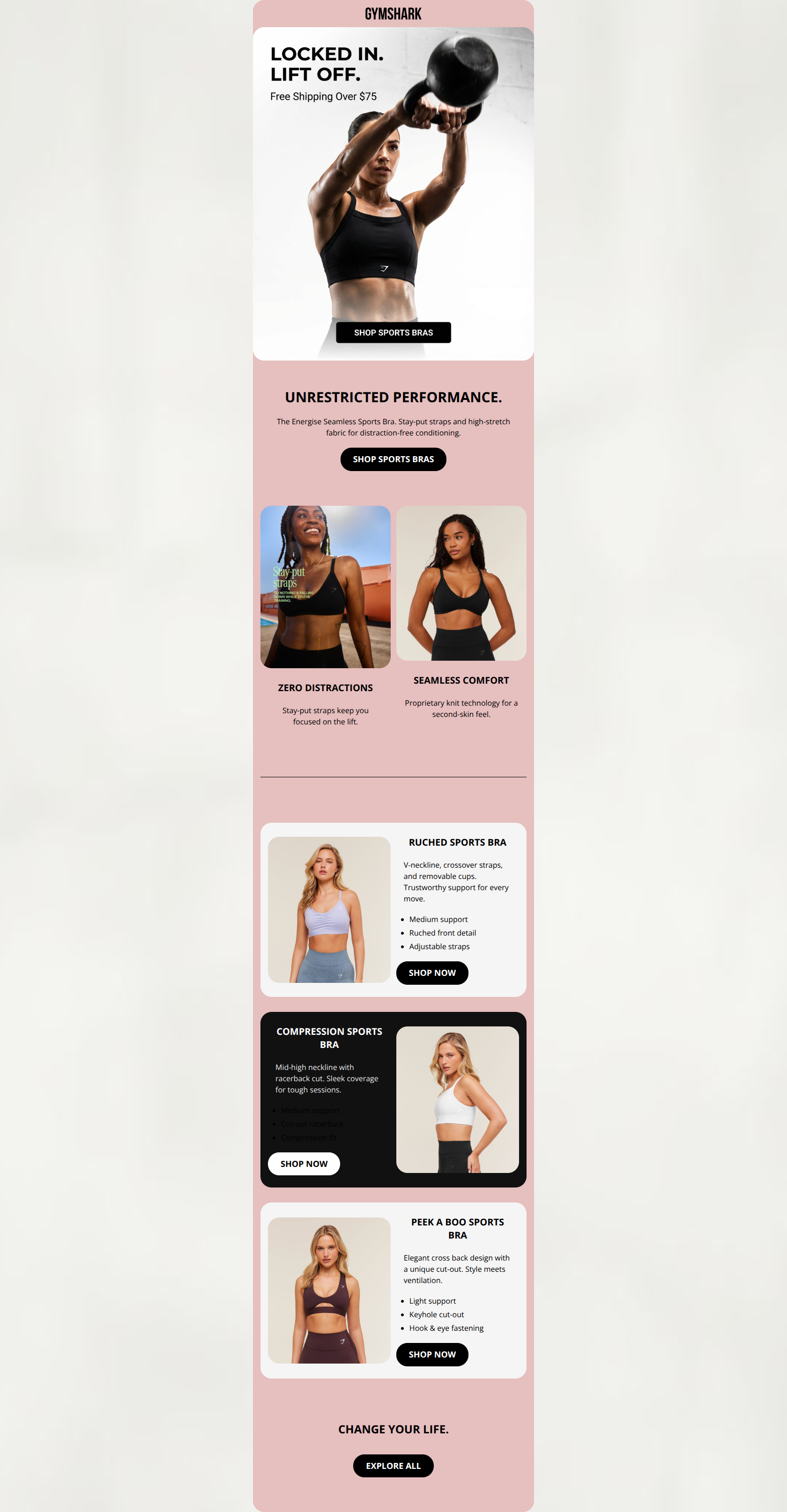 This is a strong, cohesive example of brand-led product storytelling. The email excels at connecting features (seamless knit) to benefits (distraction-free conditioning) using a clean, readable layout. However, it leaves conversions on the table by using generic 'Shop Now' buttons for specific items and missing critical social proof elements like star ratings on the product cards.