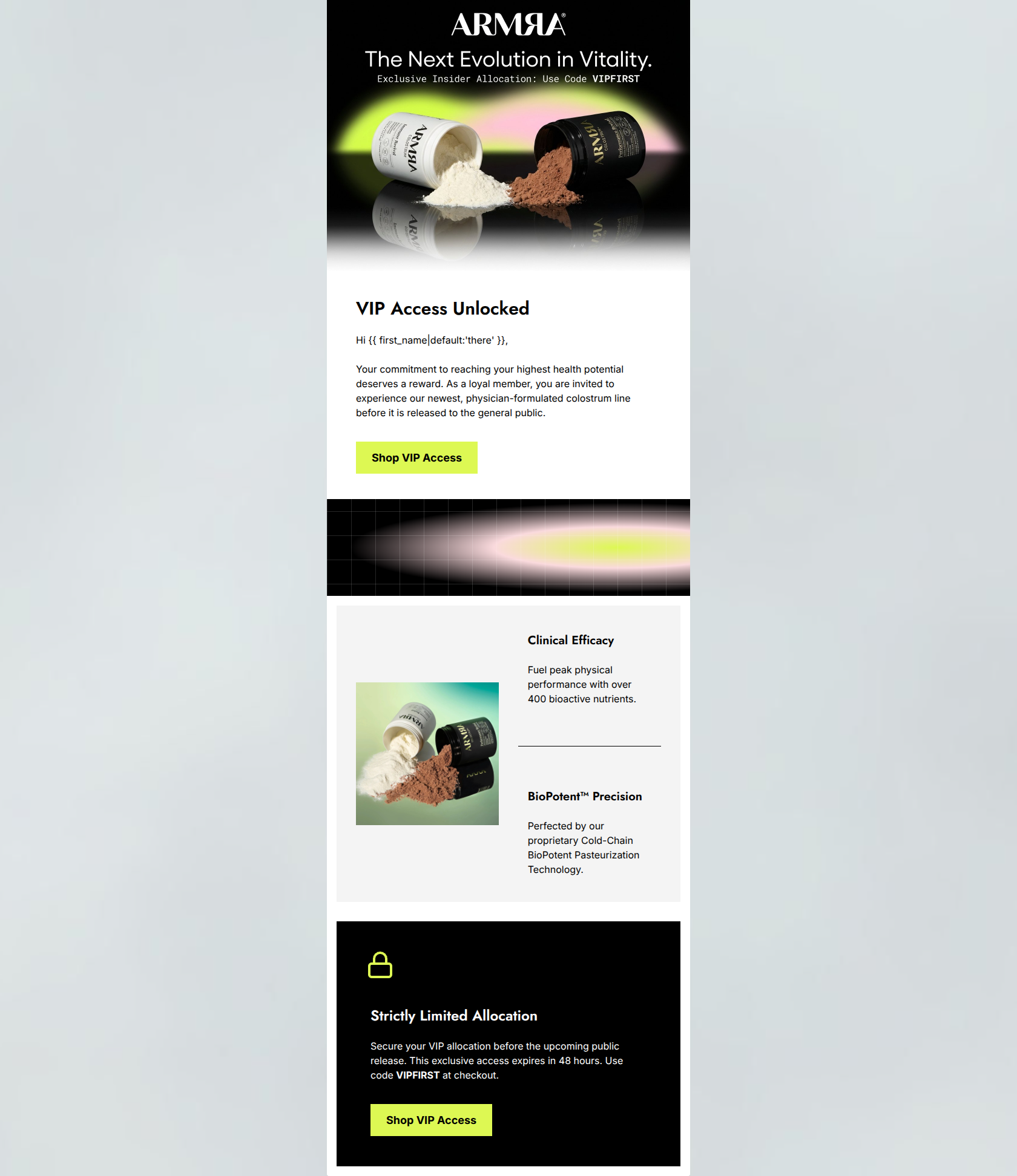 77/100This email is visually stunning and aligns perfectly with ARMRA's premium, clinical-yet-energetic brand identity. The stark contrast, neon accents, and aura gradients create an immediate sense of high-end biotechnology. However, the email leans too heavily on exclusivity at the expense of clarity. It creates a 'mystery meat' scenario by repeatedly hyping a 'newest colostrum line' without ever stating what the new product actually is (e.g., a new flavor, a targeted formula, a travel format). Additionally, while a VIP code is provided, it is unclear if this code grants a discount or simply unlocks the ability to purchase. Clarifying the actual product being launched and the specific benefit of the VIP code will significantly improve the click-through rate.