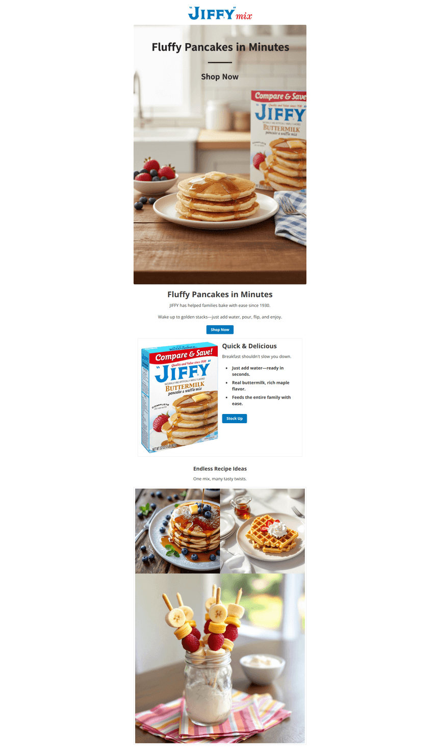 Strong appetizing visuals and a clear speed/convenience promise. Biggest opportunities are clarifying the value/pack youβre selling, giving readers two clear paths (buy online vs. find in-store), and turning the recipe inspiration into clickable engagement that drives sessions and assists conversion.