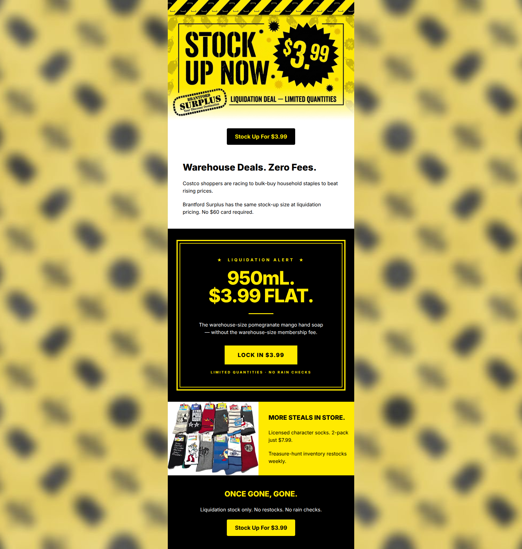 71/100This email nails the brand's aggressive, utilitarian tone and leverages high-contrast design effectively to create urgency. The copy is tight and directly attacks customer pain points like inflation and competitor membership fees. However, it suffers from a massive execution flaw: the hero section aggressively pushes a $3.99 price point but completely fails to show or name the product being sold. Users are asked to click before they even know what they are buying. Furthermore, introducing a secondary offer (socks) with a different destination link dilutes the primary conversion goal. Fixing the hero context and removing distractions will drastically improve click-through rates.
