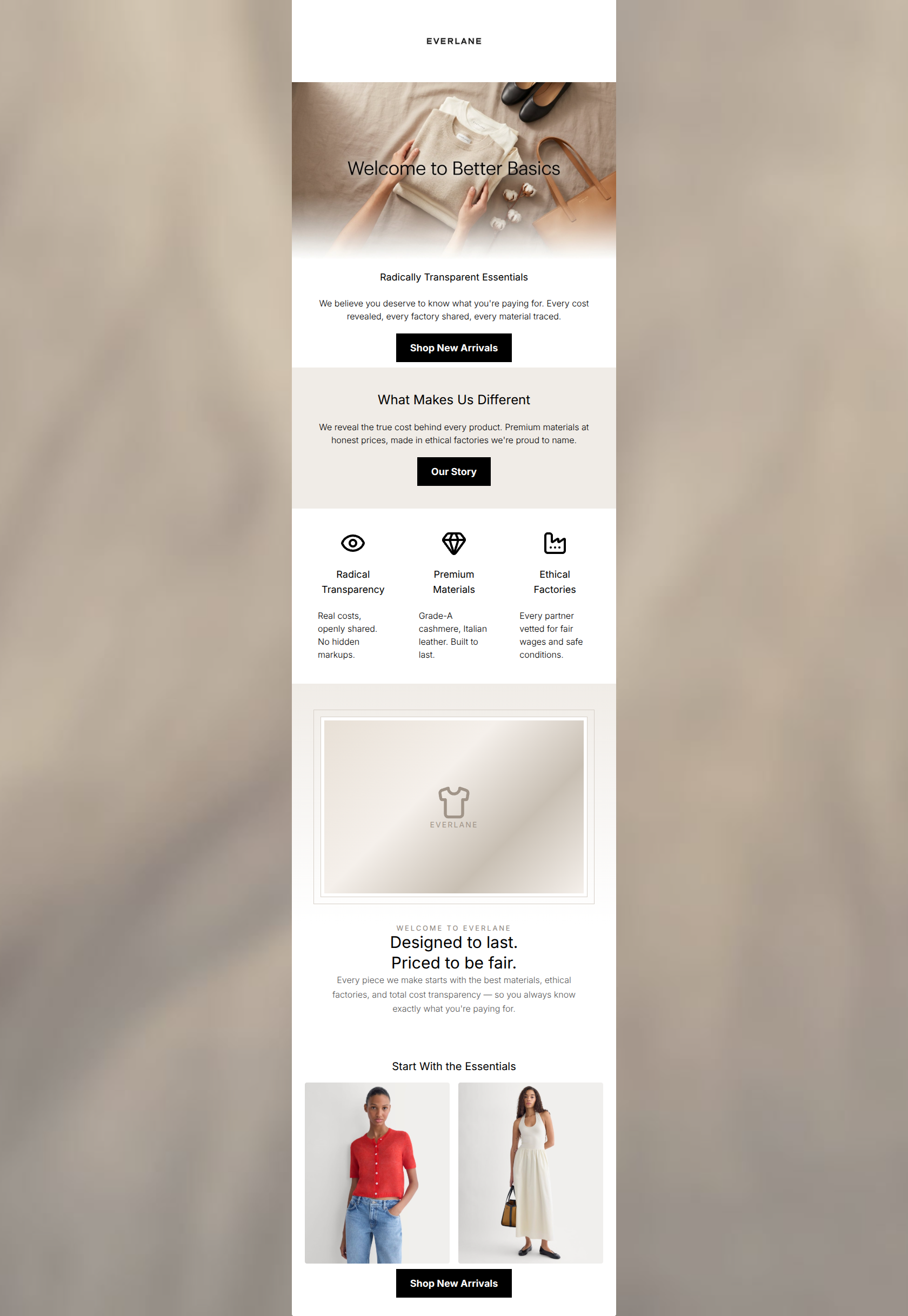 65/100This welcome email establishes Everlane's clean, minimalist aesthetic and clearly communicates its core value proposition of 'Radical Transparency.' However, it suffers from severe structural redundancy and copy bloat. It essentially restarts its own narrative halfway through with a second 'Welcome' section, and repeats the exact same messaging about transparent pricing and ethical factories in four different sections. This repetition dilutes the impact, increases cognitive load, and wastes valuable real estate that could be used to showcase products or guide the user to specific categories. The email feels less like a cohesive conversion journey and more like a collection of brand statements stitched together.