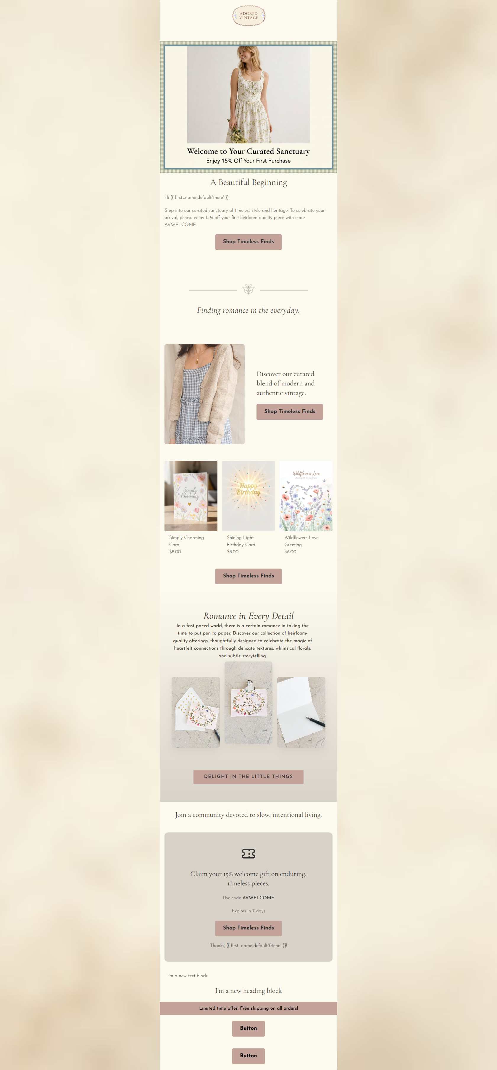 77/100This welcome email beautifully establishes the brand's wistful, vintage aesthetic while clearly communicating the 15% off introductory offer. However, repetitive calls-to-action and the baffling choice to highlight low-ticket greeting cards rather than premium apparel undermine the potential impact of the discount. COLOR & CONTRAST NOTES: The brand palette is well-implemented and maintains the 'soft, minimal' aesthetic. The primary button color (#C4A49A) with dark text (#333333) has decent contrast, but its muted tone means it does not 'pop' aggressively from the background, which slightly hinders conversion visibility.