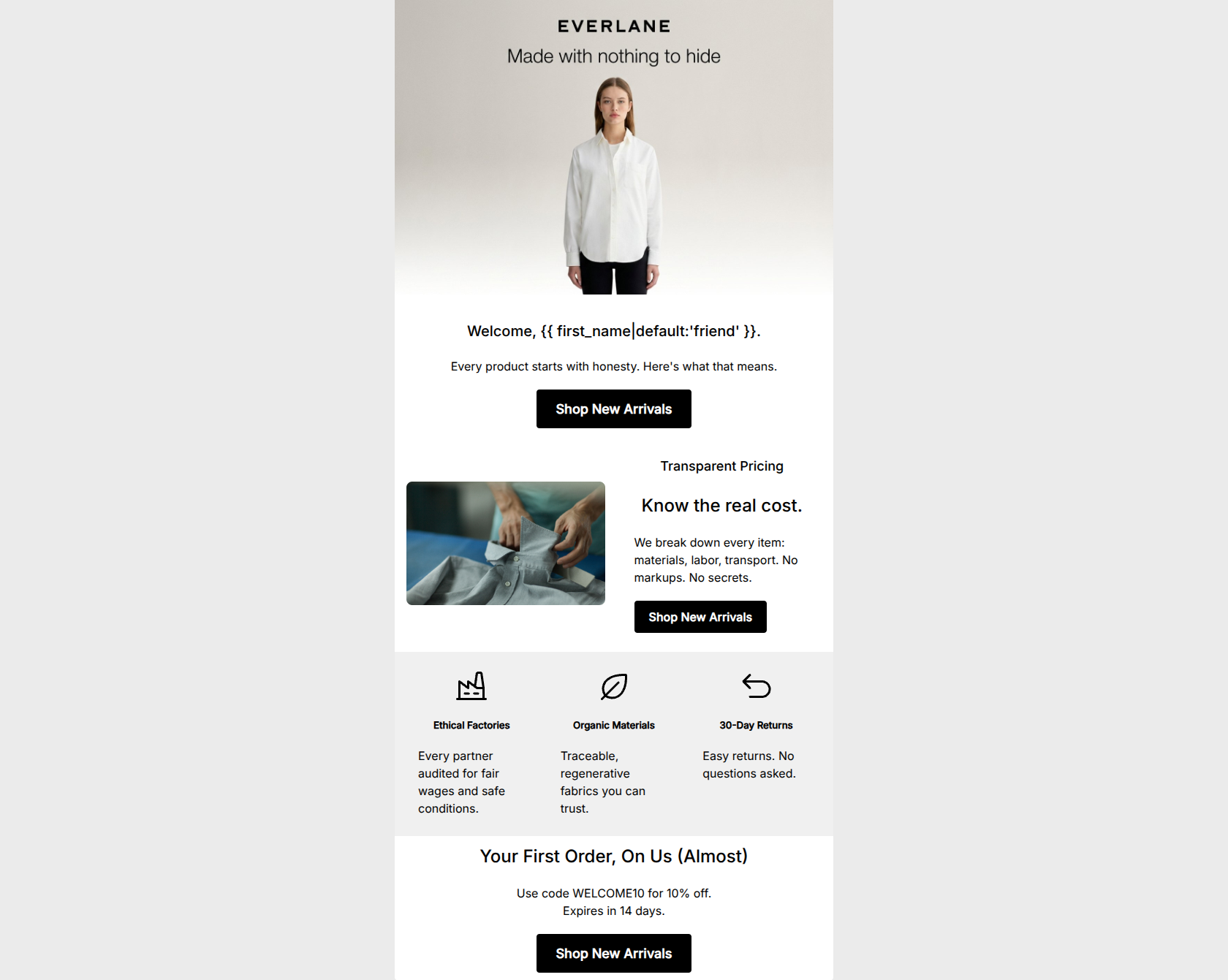 84/100This welcome email executes Everlane's minimalist, ultra-transparent brand identity with high fidelity. The visual hierarchy is clean, the monochrome palette aligns perfectly with the brand, and the primary call-to-action is correctly repeated throughout the design to drive users toward a single goal. However, while the brand storytelling is strong, the conversion architecture buries the primary financial incentive (the 10% welcome offer) at the very bottom of the email. Additionally, minor copy misalignments create slight friction in the narrative flow. Elevating the offer and tightening the tone will push this from a strong brand piece to a highly effective conversion engine.