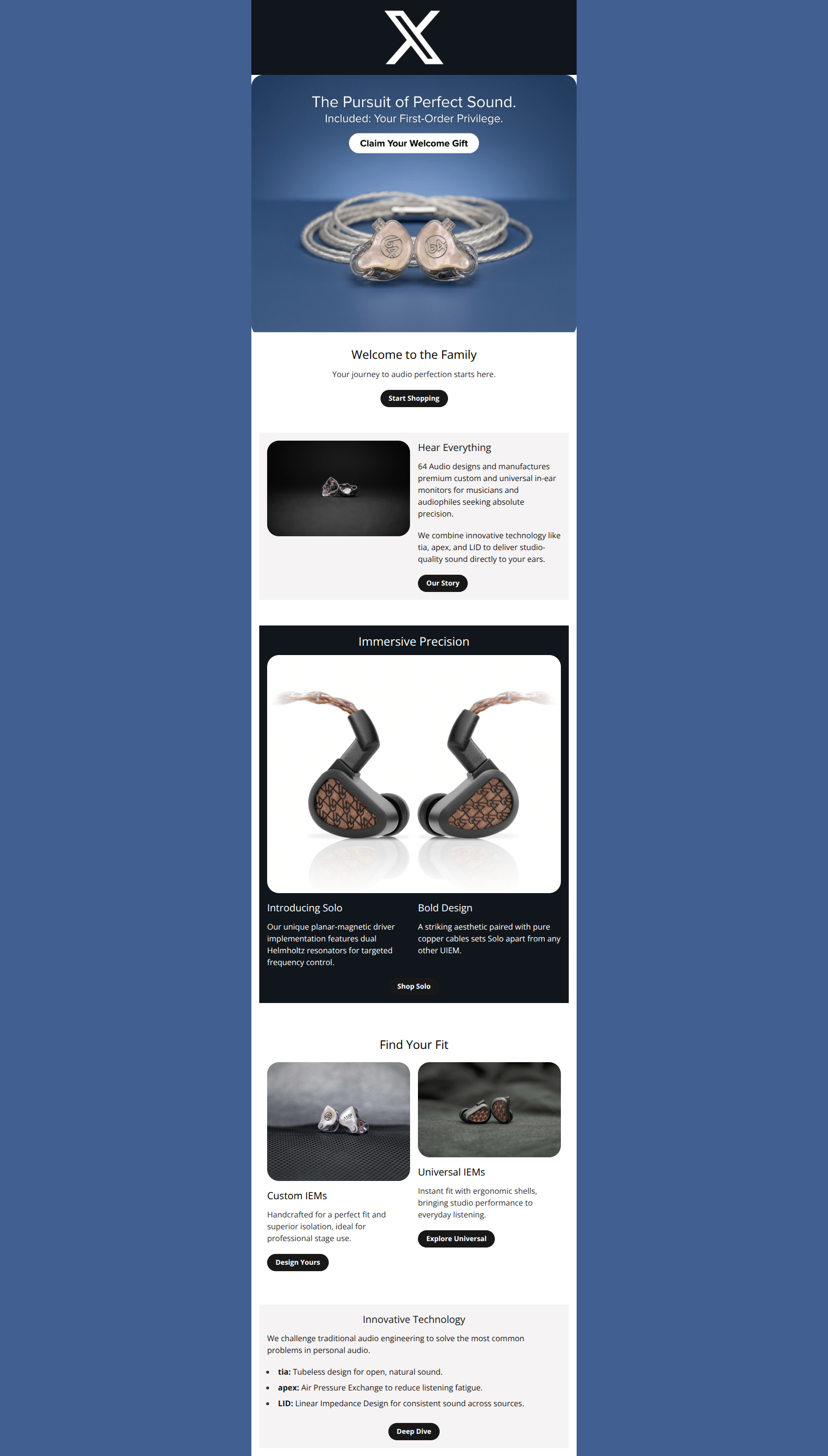 This email succeeds in conveying a premium, high-fidelity brand image through high-quality visuals and a clean layout. However, the primary conversion driver—the welcome offer—is vague ("First-Order Privilege") and trapped inside an image, likely reducing click-through rates significantly. Improving the clarity of the offer and converting image-text to live text will drive immediate lift.