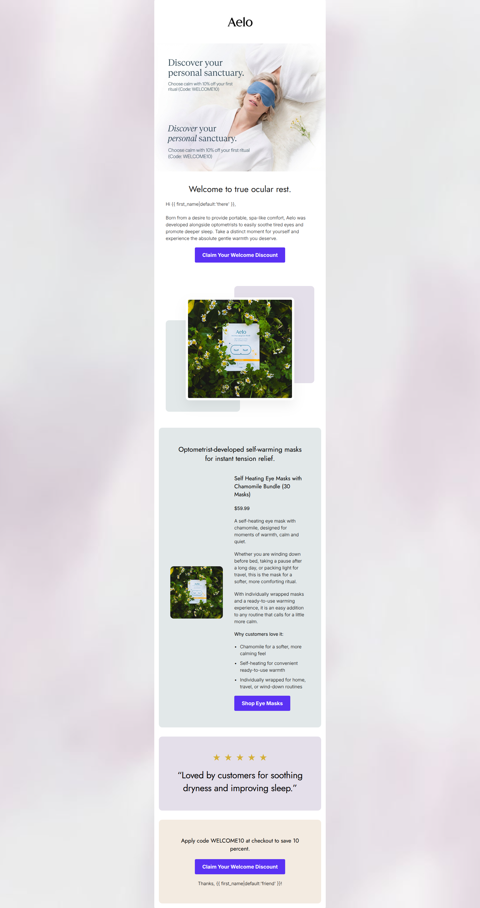 71/100This welcome email establishes a strong brand voice and utilizes highly visible, action-oriented CTAs. However, a glaring visual error in the hero image—where text is duplicated and overlapping—introduces immediate visual friction and undermines the brand's core promise of 'calm' and 'rest.' While the product value proposition is compelling, the core offer details (the promo code) are buried, forcing the user to work too hard to convert. Fixing the hero section and pulling crucial information out of images will drastically improve the click-through rate.