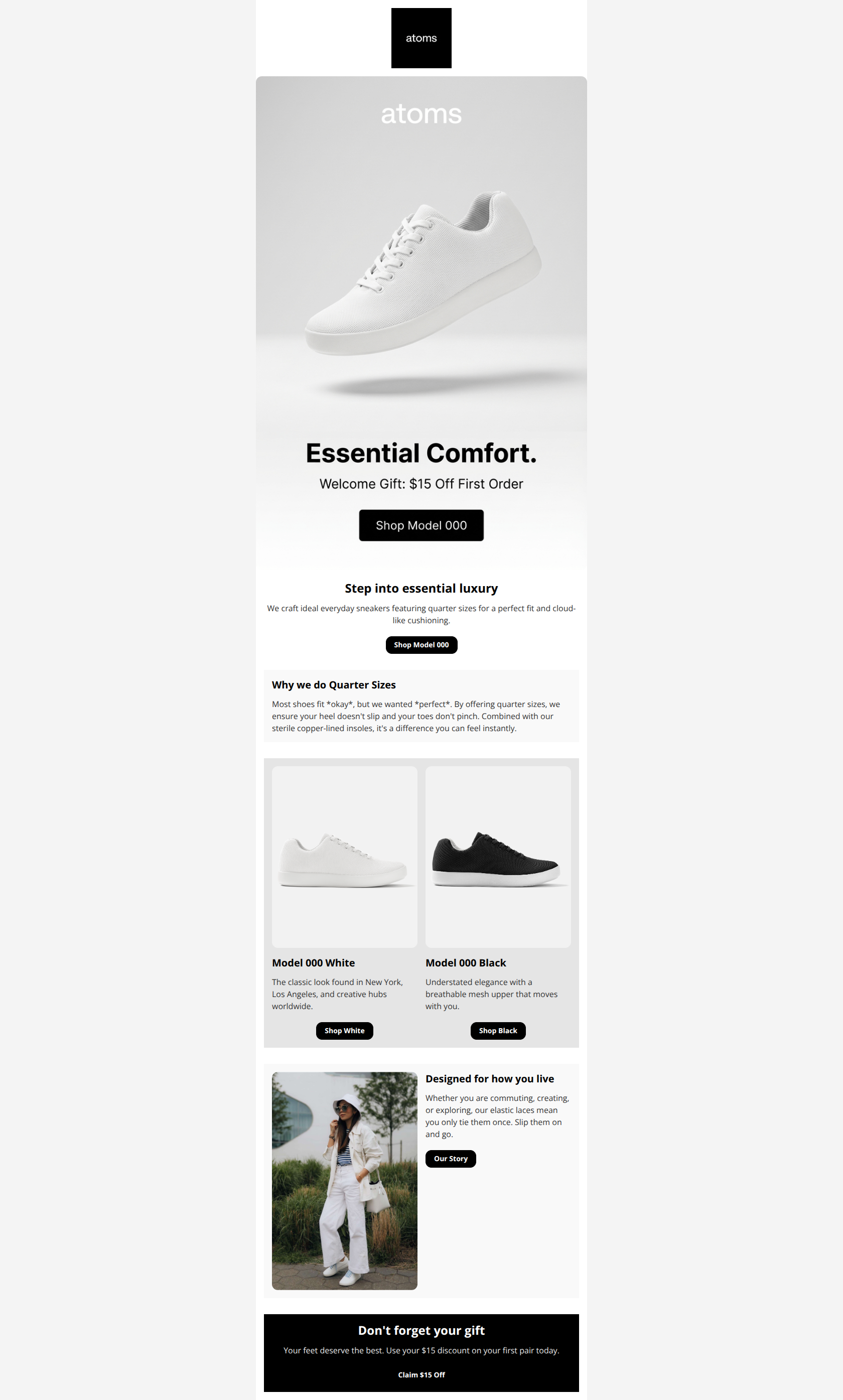 This email effectively communicates the brand's 'essentialist luxury' aesthetic with a clean, high-contrast design and a clear financial incentive. However, the layout suffers from a redundant 'double hero' structure at the top that splits attention, and the brand's key differentiator (quarter sizes) is buried in a dense text block rather than being visualized.