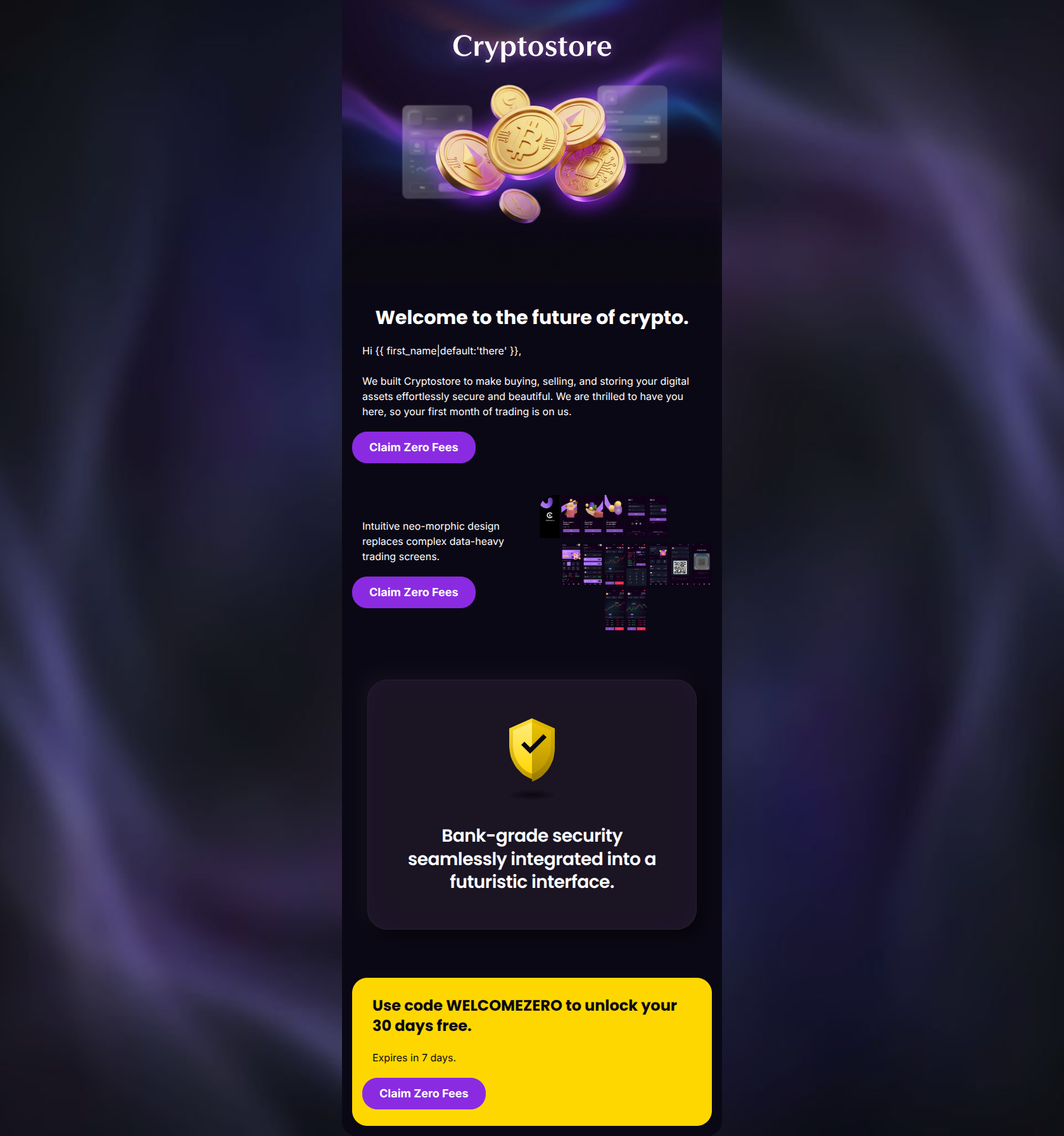 This welcome email establishes a strong, premium visual aesthetic and leads with a compelling financial offer. However, it leans too heavily on 'cool' design terminology over clear user benefits, and repetitive CTAs alongside illegible UI screenshots drag down the overall conversion momentum.