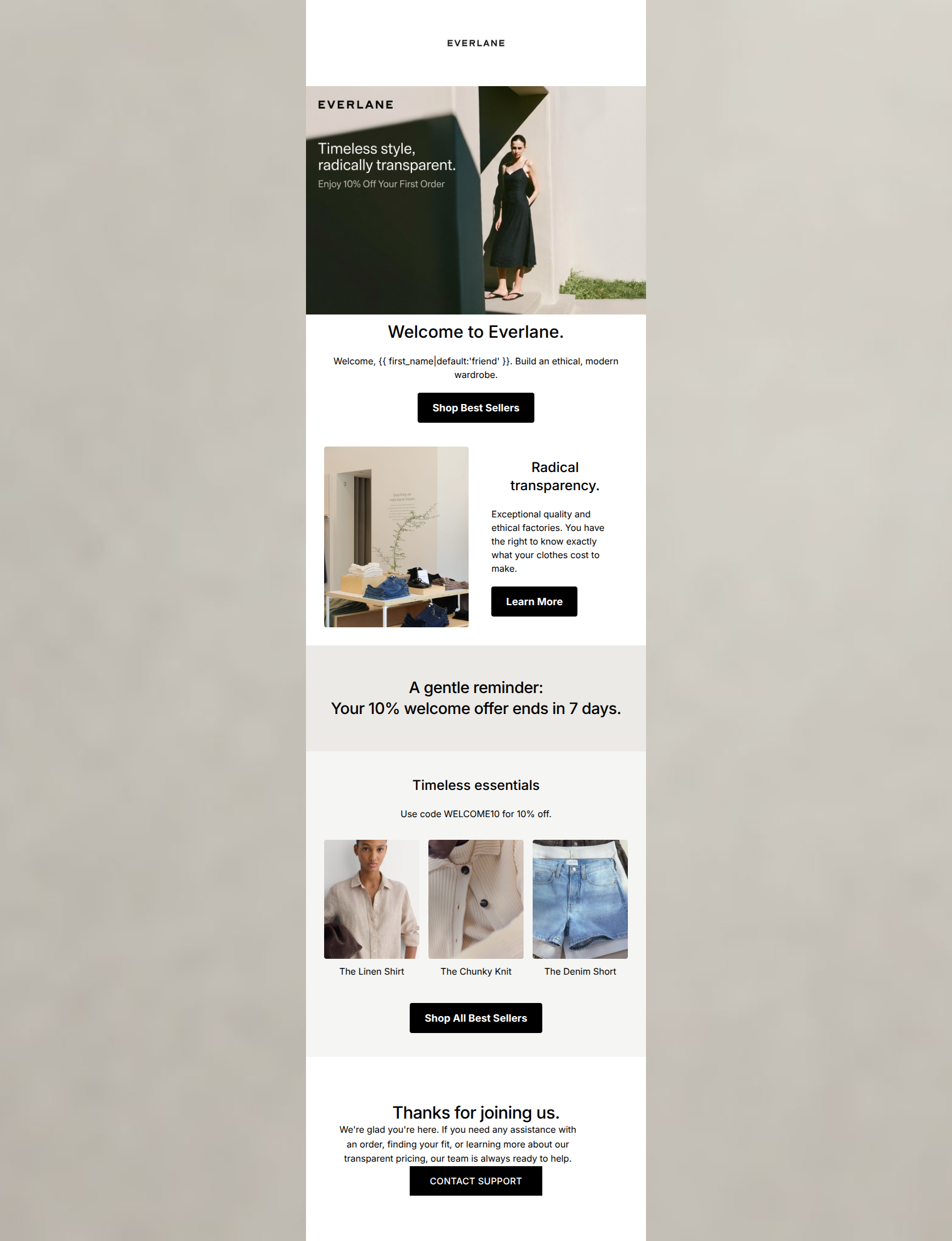 78/100This welcome email strongly aligns with Everlane's minimalist, 'quiet luxury' aesthetic and clearly communicates the core value proposition of radical transparency. The visual layout is clean and scannable. However, it suffers from a major structural conversion flaw: the 10% welcome offer is promised in the hero image and reiterated in a middle banner, but the actual promo code (WELCOME10) is buried in the third section. This forces high-intent users to either abandon their cart when they realize they do not have the code, or scroll extensively to find it. Fixing the offer flow and establishing a clearer visual hierarchy between primary shopping CTAs and secondary brand education CTAs will immediately lift click-through and conversion rates.