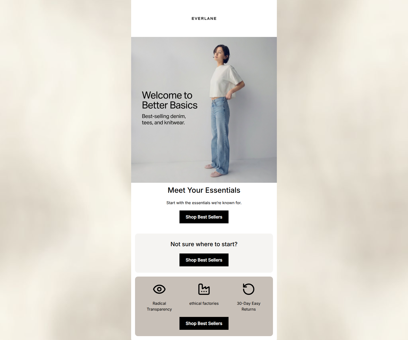 68/100This welcome email successfully captures Everlane’s signature minimalist aesthetic and 'clean luxury' vibe through excellent photography and generous whitespace. However, it suffers functionally from severe repetition and structural redundancy. By deploying three identical 'Shop Best Sellers' CTAs in rapid succession and repeating the word 'essentials' in the opening copy, the email feels more like a stacked template than a thoughtfully curated brand introduction. To elevate this from acceptable to highly converting, the email needs to diversify its click paths, fix glaring typographical inconsistencies, and integrate its strong value propositions higher in the visual hierarchy.