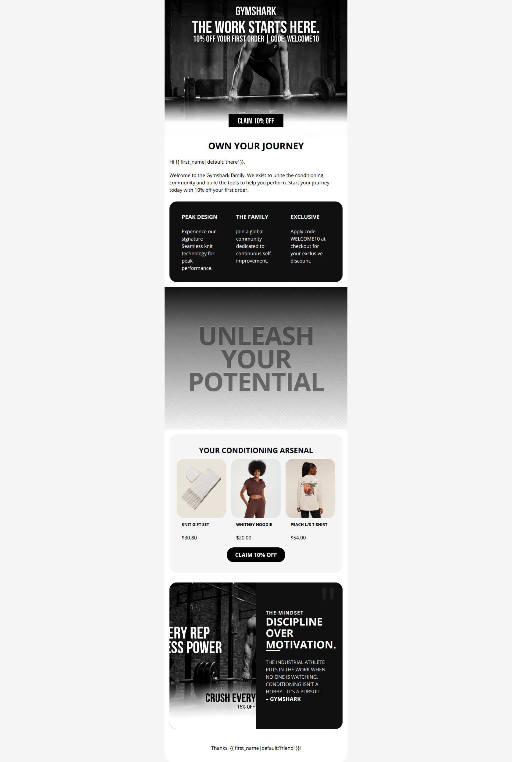 This welcome email effectively establishes Gymshark's gritty, high-performance brand identity and clearly communicates the introductory 10% offer. However, conversion is hindered by a poorly placed primary CTA that disrupts the visual flow and a massive, unclickable interstitial banner that creates a 'dead zone' for engagement.