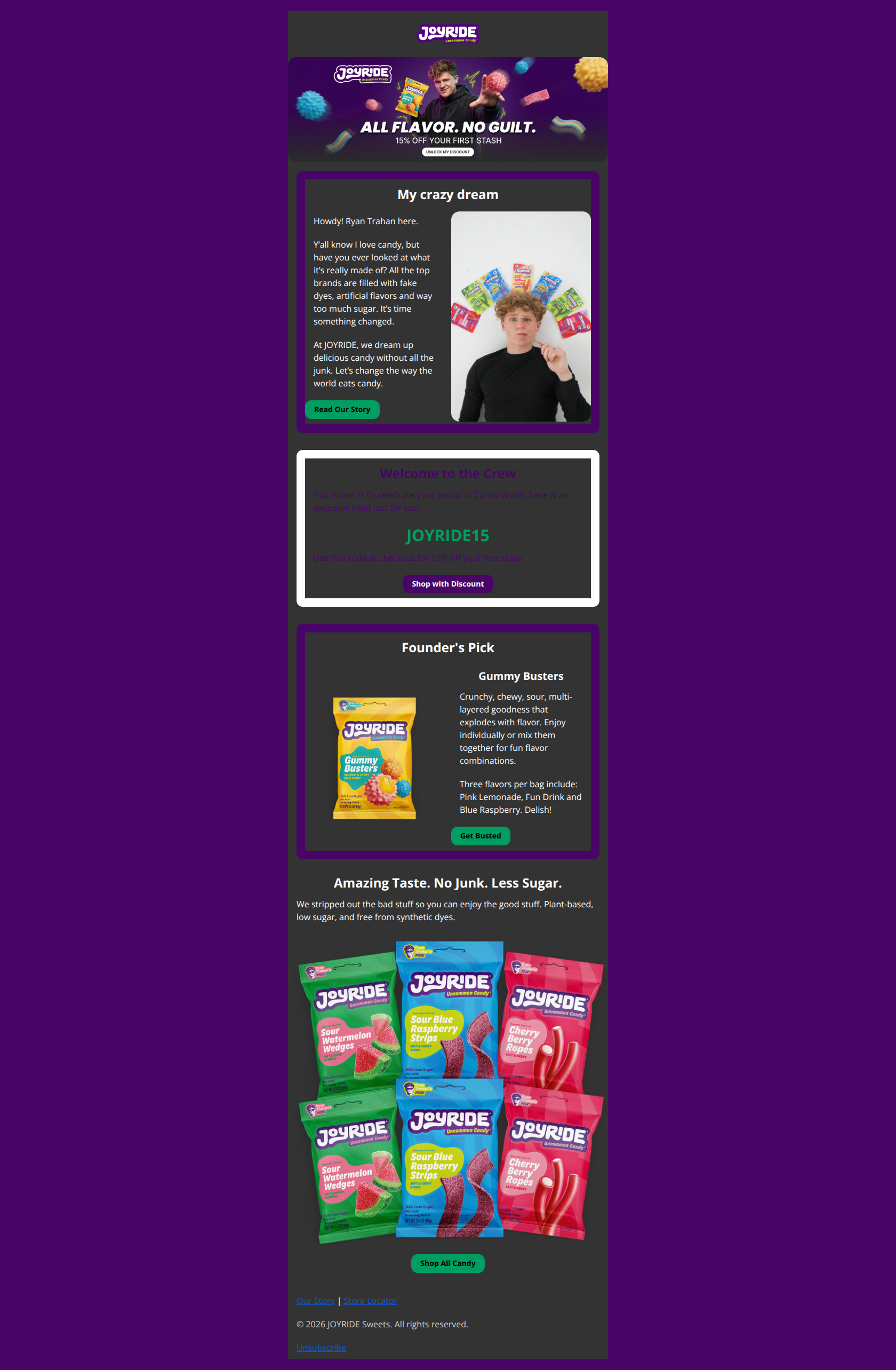 This email has a strong brand personality and a clear value proposition, but it suffers from a critical readability failure in the primary offer section. While the hero and founder content are engaging, the 'Welcome to the Crew' section renders dark purple text on a dark background, making the core discount code and instructions effectively invisible.