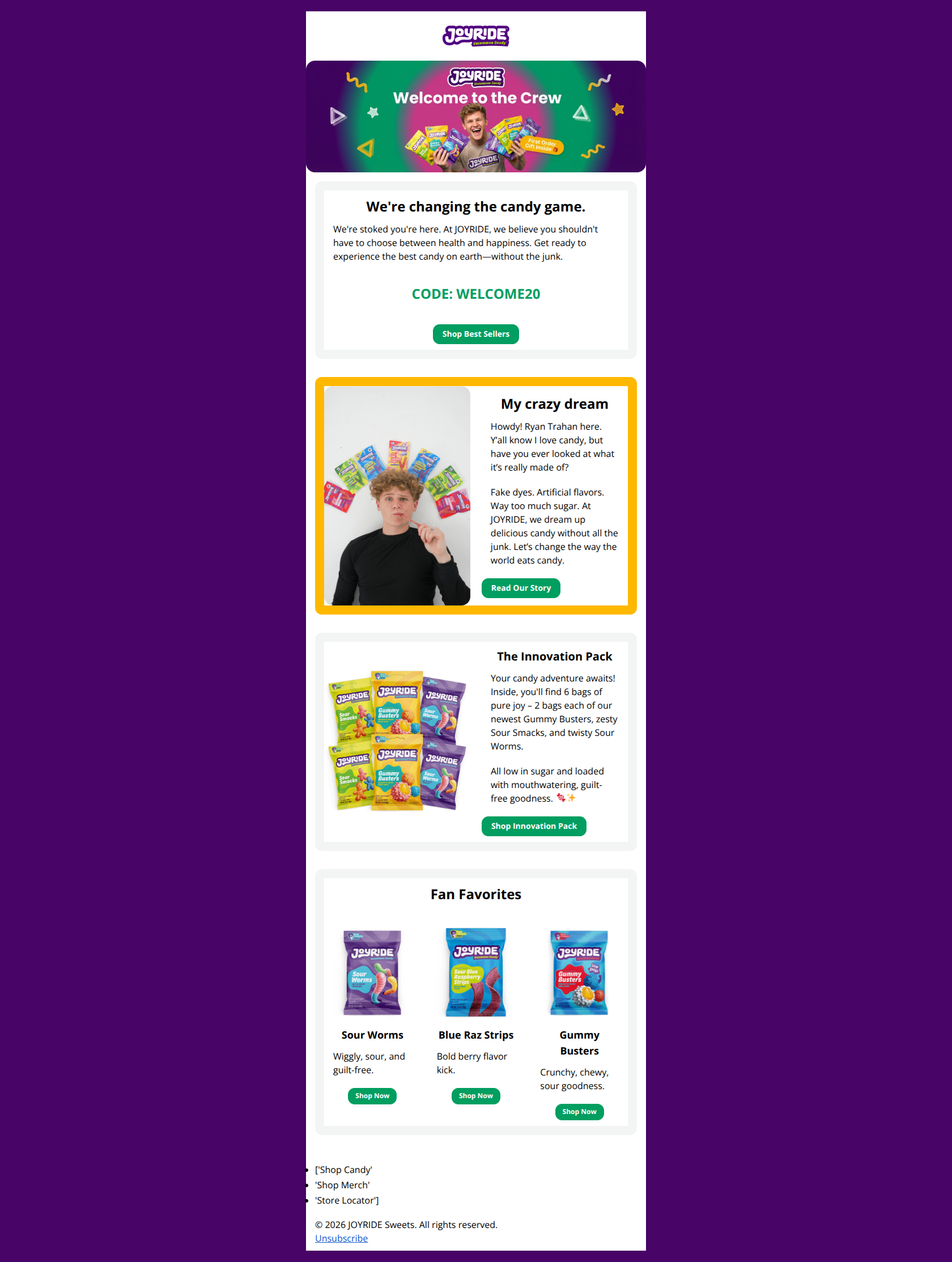 This is a strong, on-brand welcome email that effectively leverages the founder's personality and visual identity. The primary conversion path is clear, but the email suffers from offer ambiguity (assuming the user knows what 'WELCOME20' provides) and some dense text blocks that slow down the scanning experience.