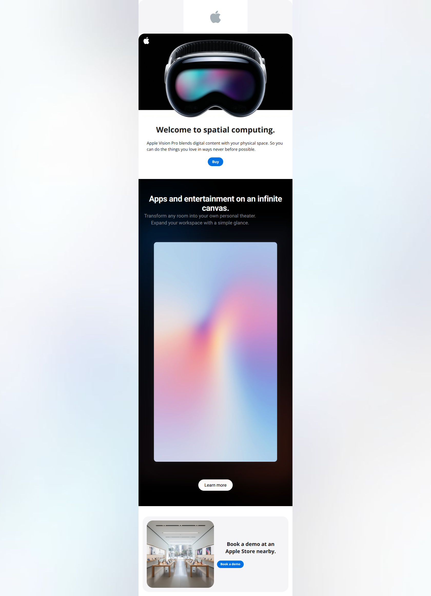 This email effectively utilizes Apple's signature minimalism and high-quality hero imagery to establish a premium tone. However, it suffers from a significant disconnect in the middle section where the visual (an abstract gradient) fails to support the headline promising "apps and entertainment." Additionally, relying solely on a high-friction "Buy" CTA in the hero for a high-consideration, $3,500 product likely suppresses click-through rates compared to an educational or demo-focused approach.
