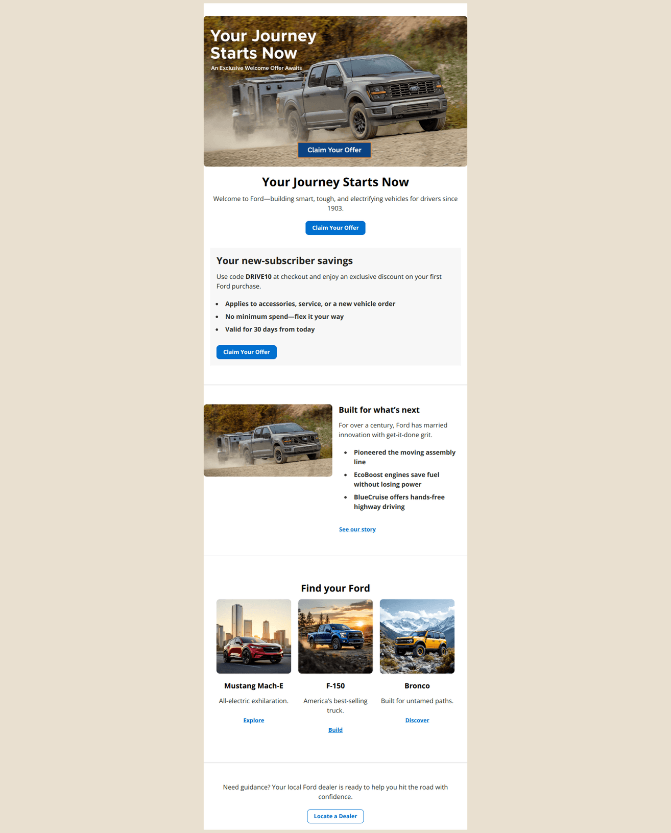 Strong, brand-right welcome email with a clear hero and simple pathing, but the promotional offer is too vague and the primary CTAs donβt take people to a place where the code can be redeemed. Tightening offer clarity, adding legal, and aligning CTAs/links to appropriate destinations will materially improve conversion. Consider light personalization to surface nearby dealers and relevant vehicles.