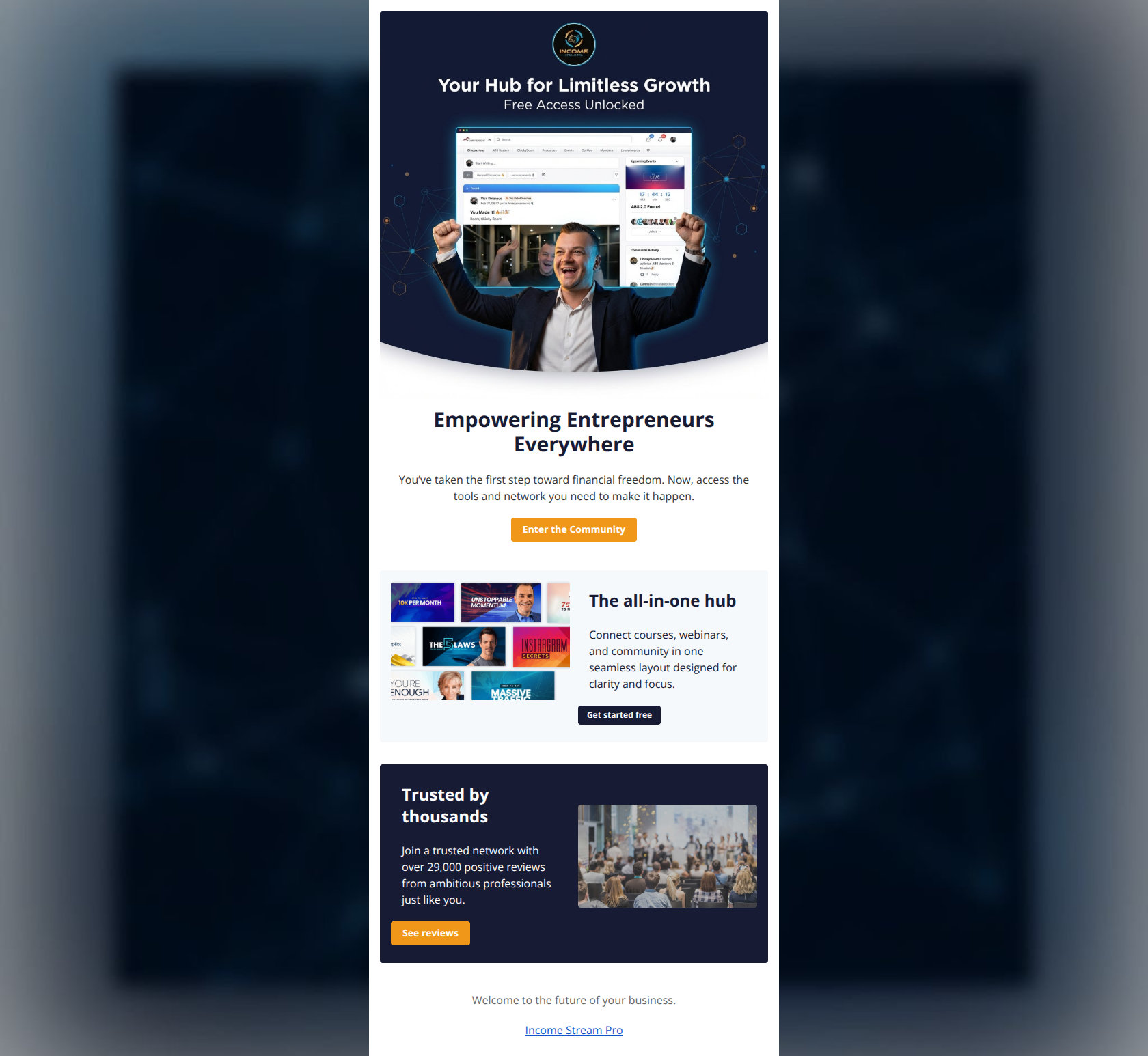 This email succeeds at visual authority, using a polished 'corporate trust' aesthetic that perfectly matches the brand identity. However, it suffers from 'slogan-itis': the copy relies on vague, aspirational statements ('Empowering Entrepreneurs') rather than concrete value hooks. The strongest offer ('Free Access Unlocked') is trapped inside the hero image text, disconnected from the HTML headline, meaning the email looks great but doesn't fight hard enough for the click.