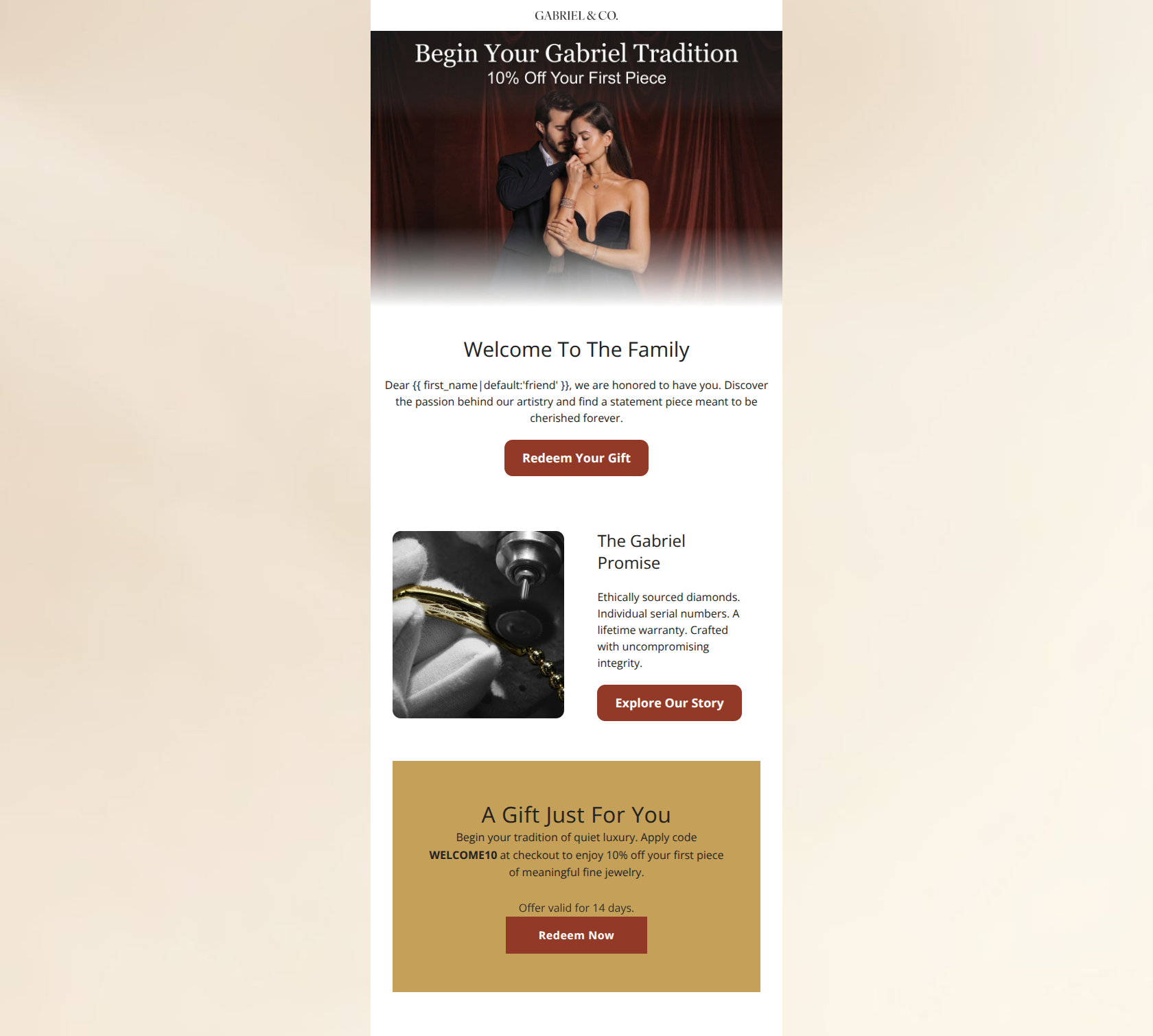 77/100This welcome email effectively establishes Gabriel & Co.'s 'Quiet Luxury' aesthetic and clearly communicates the primary 10% off offer alongside core trust-building pillars (The Gabriel Promise). The photography is strong and on-brand. However, the email suffers from competing visual hierarchy—specifically, the secondary 'Explore Our Story' CTA visually rivals the primary conversion buttons. Additionally, the hero section buries the actual promo code and relies too heavily on filler copy rather than immediately reinforcing the value proposition.
