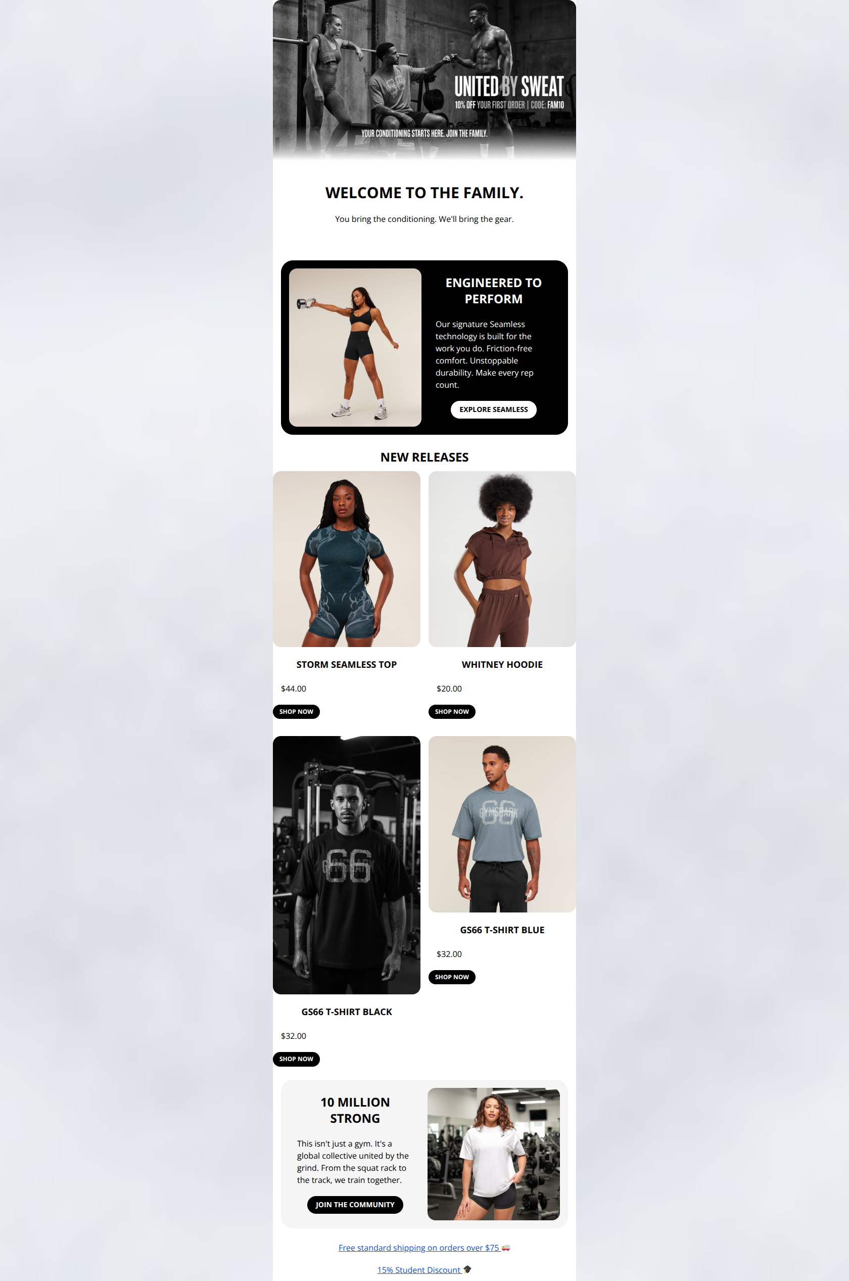 This email effectively communicates the Gymshark 'Industrial Athlete' aesthetic with strong visuals and on-brand copy, but it commits a fundamental conversion error by omitting a primary Call-to-Action (CTA) in the hero section. While the flow from brand intro to product education is logical, the user is forced to scroll past the fold to find the first clickable button, which significantly increases friction and likely reduces click-through rates.