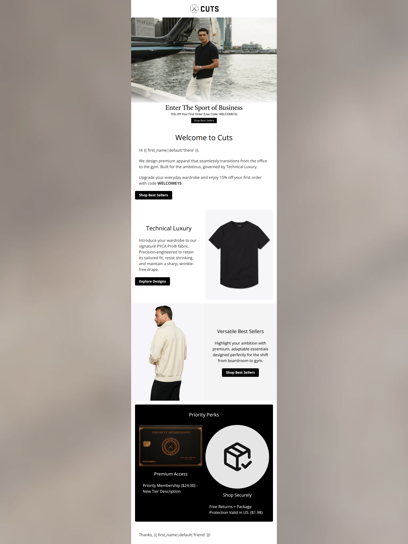 This welcome email features strong, on-brand copywriting and excellent lifestyle imagery that perfectly captures the 'Technical Luxury' vibe. However, severe structural flaws—including redundant hero sections, a broken micro-CTA, placeholder text, and the bizarre inclusion of cart-level upsells—create significant friction that will suppress first-purchase conversions.