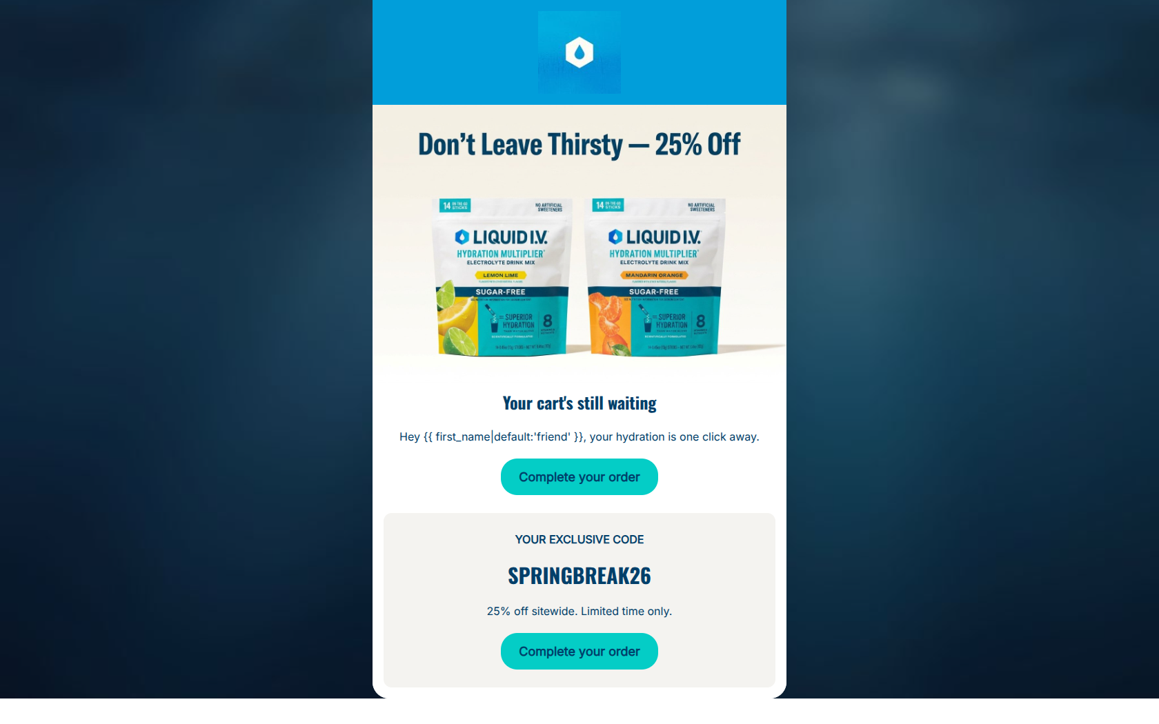 This cart abandonment email successfully combines a strong promotional offer (25% off) with a clear, repetitive CTA to drive users back to their cart. The layout is clean, scannable, and highly focused on the conversion goal. However, it leaves money on the table by functioning purely as a discount delivery vehicle rather than reminding the user *why* they wanted the product in the first place (the core value proposition of superior hydration), and it fails to visually remind them of what specific items they left behind.
