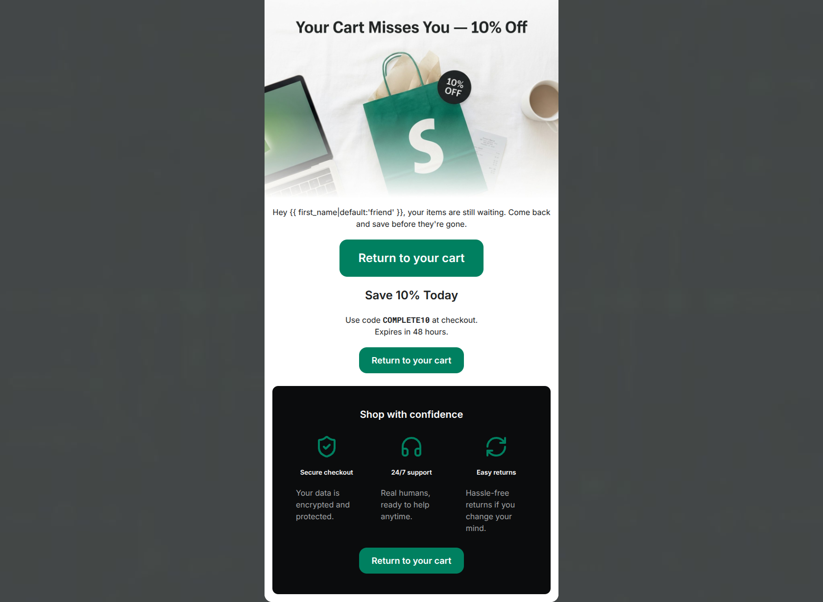 64/100This cart abandonment email successfully delivers a clear incentive with genuine urgency, anchored by a visually solid trust-building footer. However, the execution is hampered by structural redundancy and a lack of specific product context. The repetition of the discount offer and the stacking of identical CTAs creates a disjointed flow that slows the user down. Furthermore, the generic 'Your Cart Misses You' headline leans into retail clichés rather than reflecting Shopify's typically empowering, strategic brand voice. Consolidating the message and injecting the actual abandoned product details will drastically reduce cognitive load and improve click-through rates.