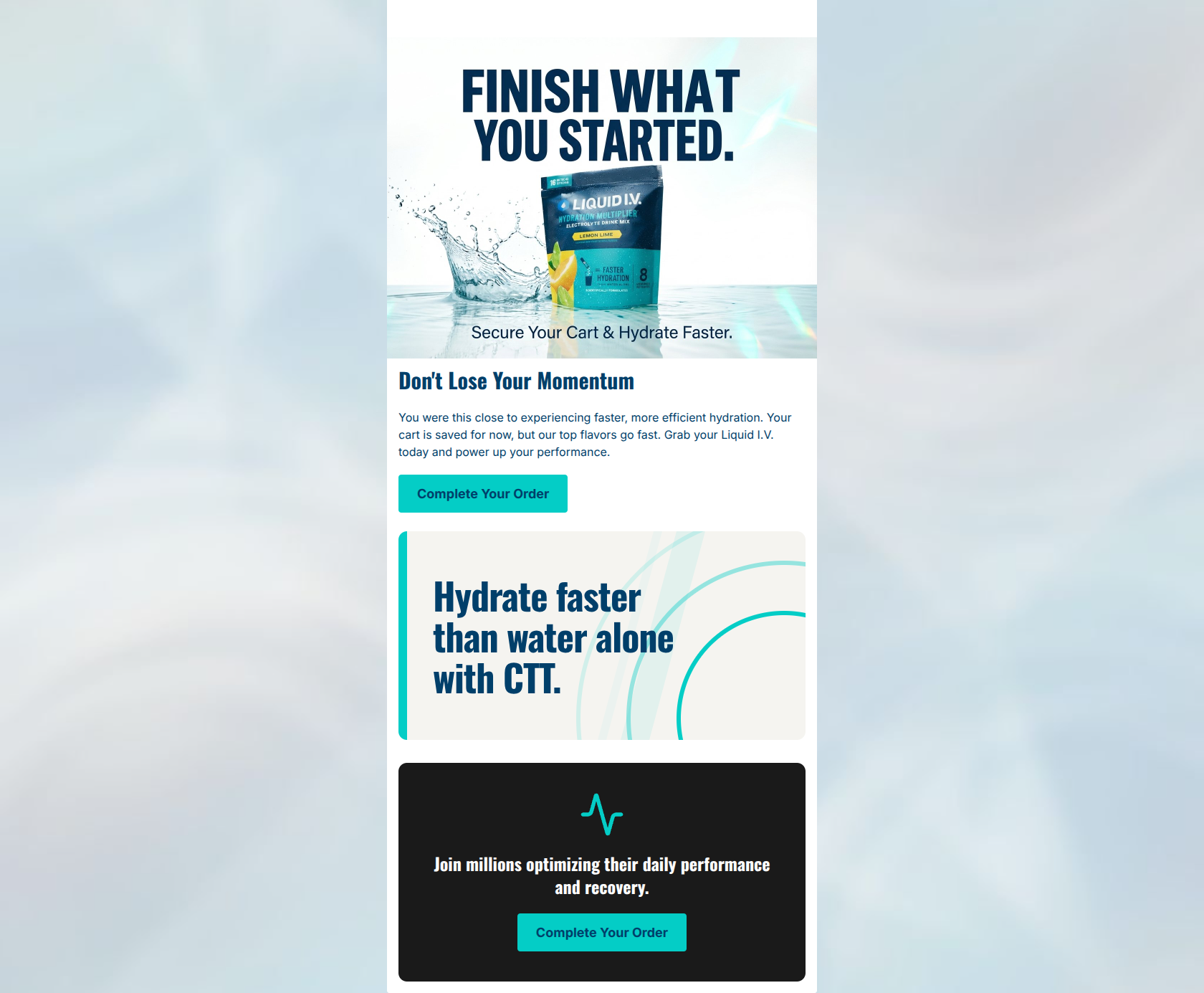 This cart abandonment email successfully captures Liquid I.V.'s energetic, high-performance brand voice and utilizes strong, on-brand color blocking. The visual hierarchy naturally draws the eye down the page. However, it completely misses the mark on the most critical element of a cart abandonment strategy: it fails to show the user what they actually left in their cart. Relying on a generic product image rather than a personalized, dynamic cart summary leaves a significant amount of conversion potential on the table.