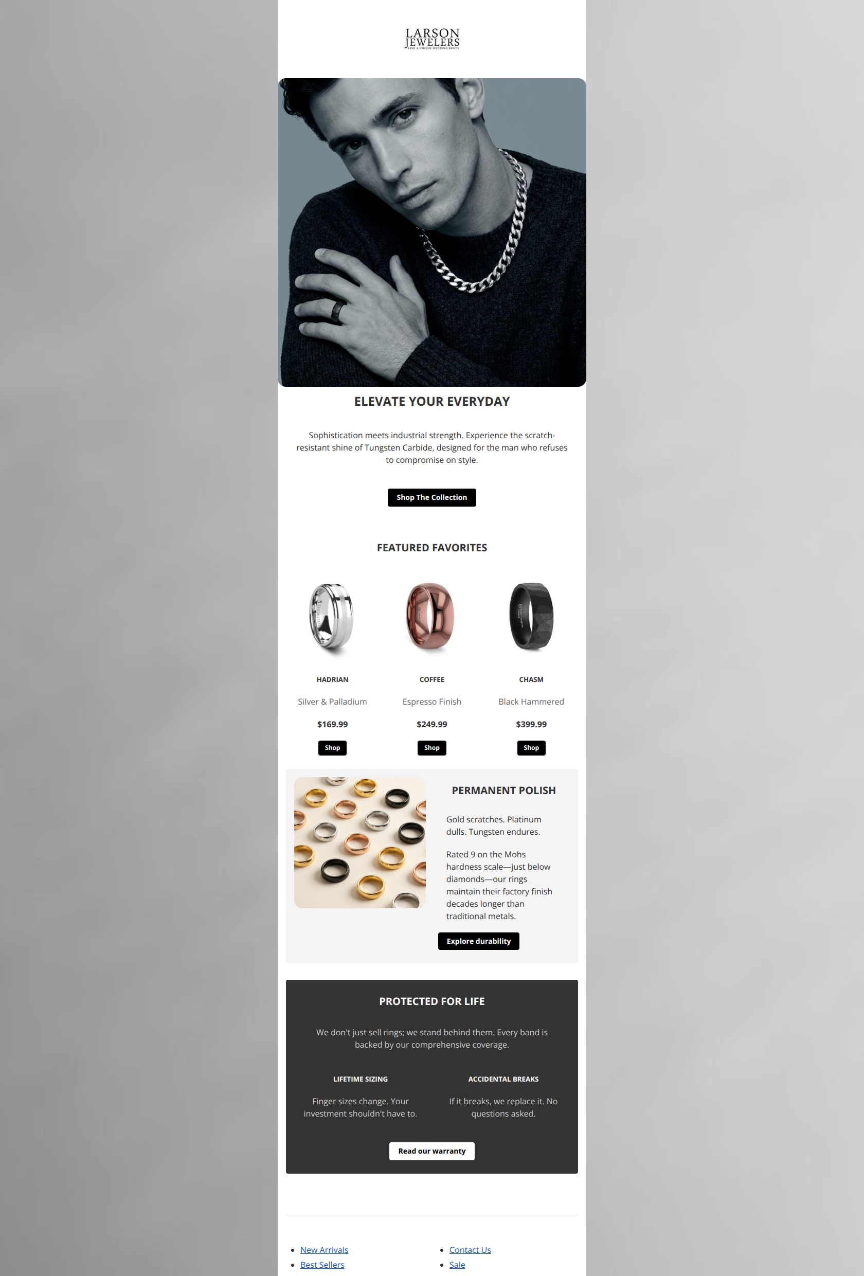 This email succeeds at establishing a 'Masculine Luxury' aesthetic with high-quality imagery and a clean, scannable layout. However, it fails to prioritize its strongest commercial levers: the 30% discount is buried below the fold, and the hero headline is a generic lifestyle platitude rather than a compelling hook. It looks professional but converts at a 'browsing' level rather than a 'buying' level.