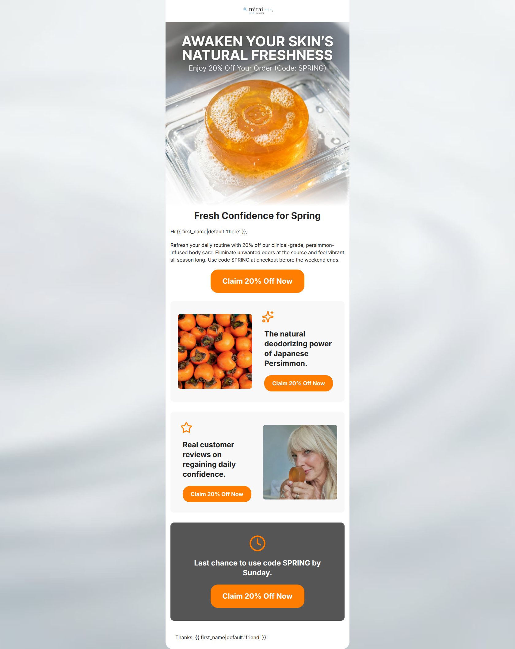 This promotional email successfully communicates a 20% discount but falls flat in conveying Mirai Clinical's specialized value proposition. It relies heavily on repetitive, transactional CTAs and sparse copy, missing the opportunity to educate the user or address their specific pain points regarding aging body odor. The structural skeleton is competent, but the content feels like an empty template, most notably in the 'Reviews' section which entirely lacks an actual customer quote.