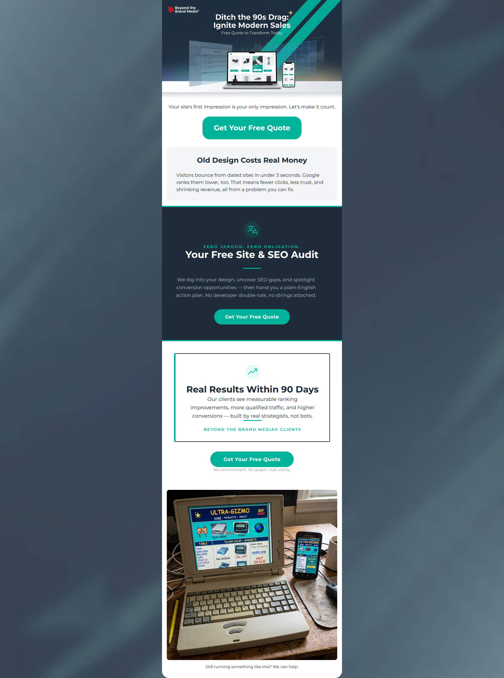 73/100This email effectively utilizes the brand's bold, high-contrast color palette and anti-jargon positioning to create a professional, visually striking impression. The dark navy central block does an excellent job of commanding attention for the core offer. However, the email suffers from a significant conversion bottleneck: a severe cognitive disconnect between the promised value (a 'Free Site & SEO Audit') and the button copy ('Get Your Free Quote'). A quote feels like a sales pitch; an audit feels like a gift. Furthermore, placing a massive, distracting image of a vintage laptop below the final Call-to-Action creates a visual exit ramp that leads users away from converting. Fixing the offer consistency and restructuring the ending will drastically improve click-through rates.